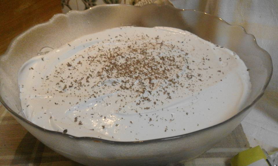 - Agora o chantilly: Bater as natas até que fiquem volumosas e cremosas, adicionar as 75 gr de açucar e bata para ficar em chantilly. Cubra com este chantilly a sobremesa e polvilhe com as raspas de chocolate.