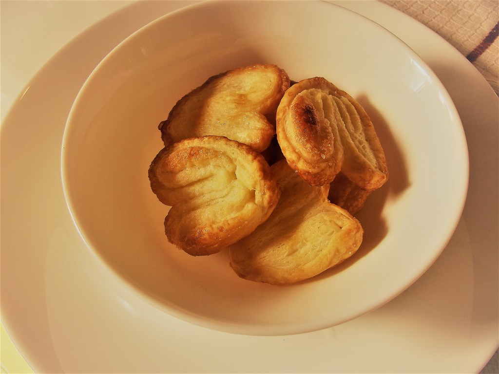 5 – O forno deve estar pré-aquecido a 180 graus e o tempo varia muito, mas é à volta de uns 15 a 20 minutos até os palmieres ficarem em formato conhecido e estarem douradinhos.
