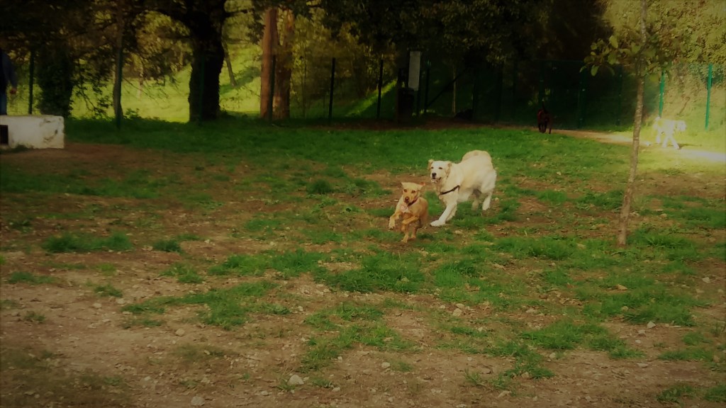 Quando descobri isto no sábado seguinte fui logo ver como era e levei o meu sheik (ainda não tinha o Davi) e adorei… é um espaço vedado com uma área com cerca de 5 mil metros quadrados, tem bebedouros, bancos, pneus para os cães se exercitarem…está fantástico! É o sitio ideal para o seu cão fazer exercício, estar ao ar livre em segurança e fazer novas amizades com outros cães!