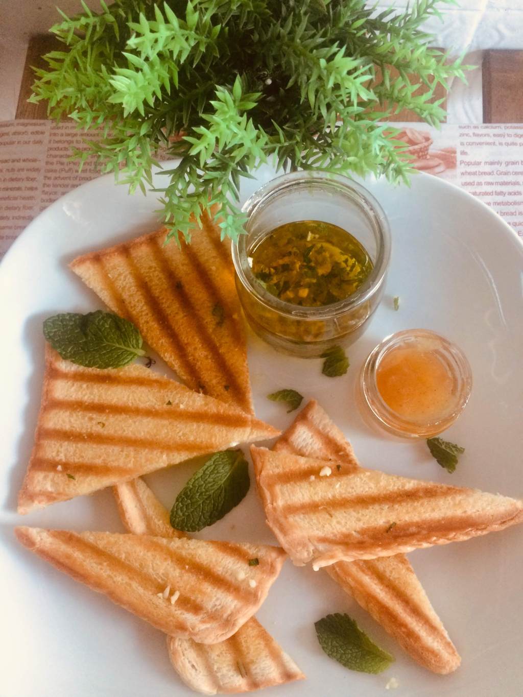 Eu coloco o pão-de-forma no grelhador eléctrico e tosto bem. Depois poderá fazer uma pasta com azeite, alho picadinho e hortelã e espalhar na torrada. Para a versão doce, espalhe o azeite e pode também adicionar compota. Ficam uma delicia!