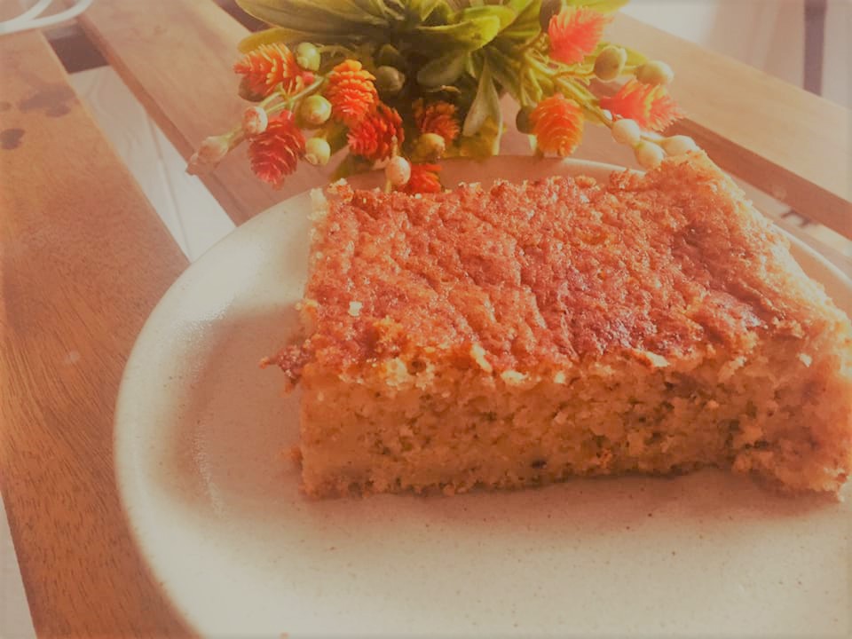 4 – Misture a canela com o açucar em partes iguais e espalhar por cima do bolo que se despeja numa forma de formato retangular.
