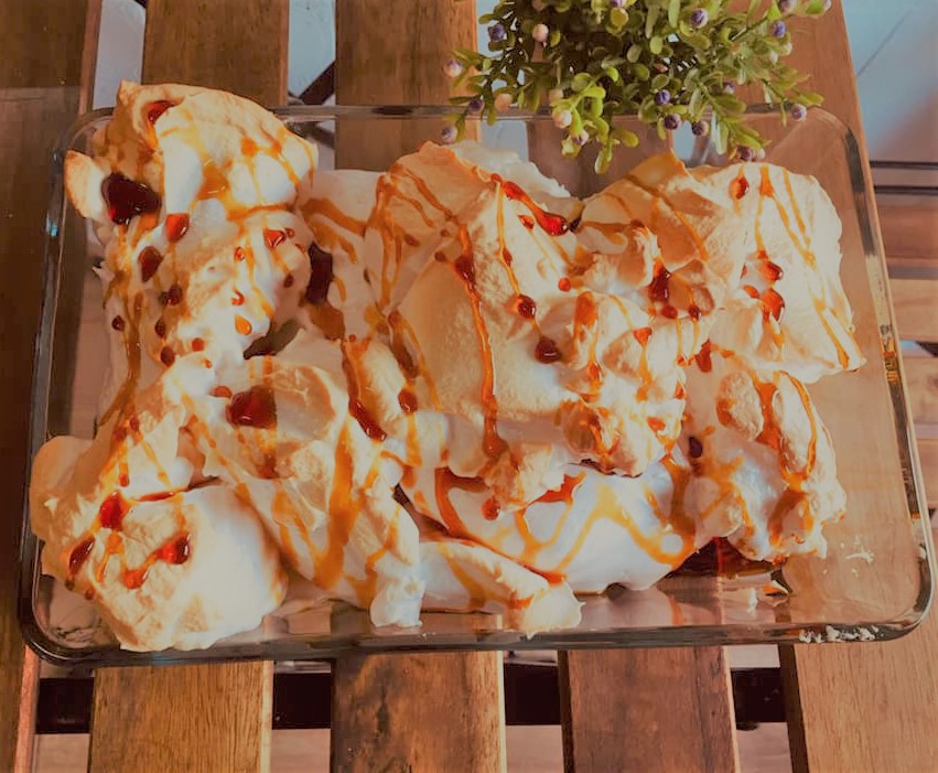 Esta é uma sobremesa muito rápida e fácil que serve essencialmente para fazer o aproveitamento de claras que tenha em casa. Ás vezes fazemos receitas que só levam as gemas de ovo e sobram-nos imensas claras…prepare rapidamente esta sobremesa, que é uma espécie de molotof mas escangalhado. A vantagem desta receita é que não tem os problemas que normalmente o molotof tradicional podem trazer que é escangalhar-se ao desenformar! Este já está por natureza 🙂