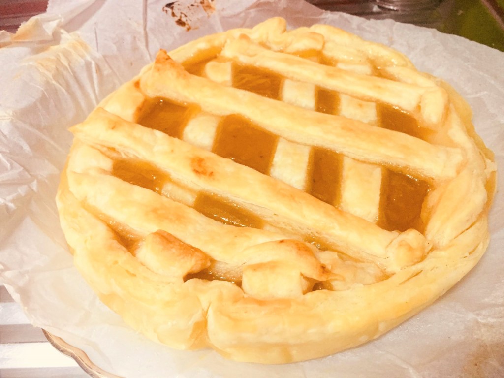 Faça com a outra placa de massa folhada umas tirinhas e sobreponha por cima do doce de maça, unindo as extremidades à outra massa folhada que serve de base.