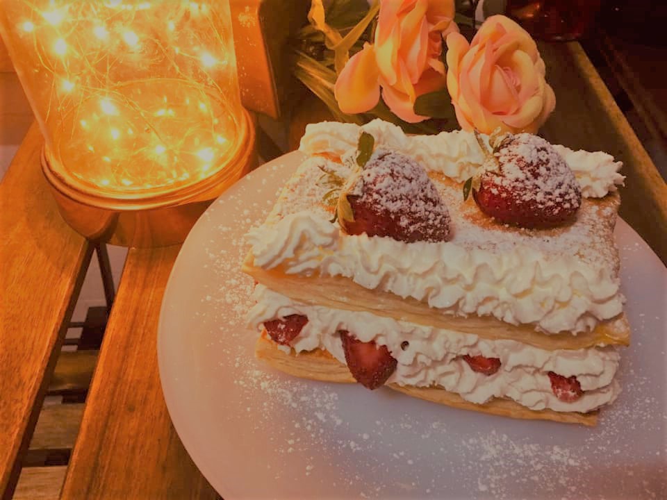 Normalmente leva 3 camadas, eu só coloquei duas. uma placa de massa folhada, chantilly por cima, morangos cortados e mais uma camada de chantilly, depois uma camada de massa folhada e finalizei com 2 morangos inteiros e chantilly.