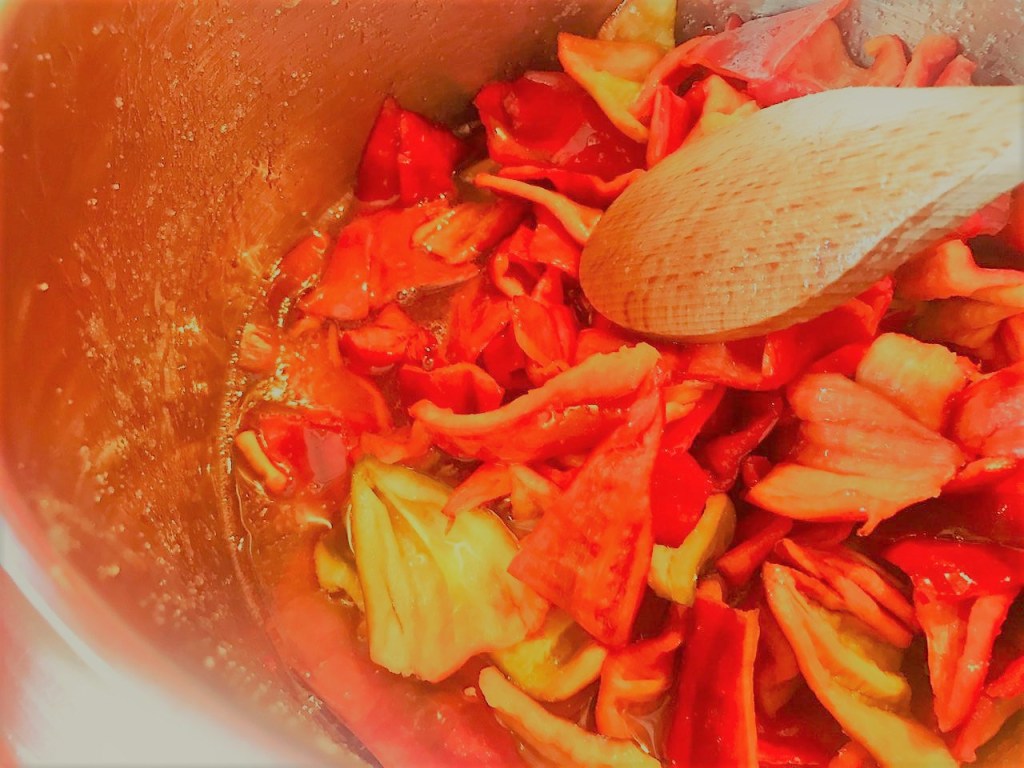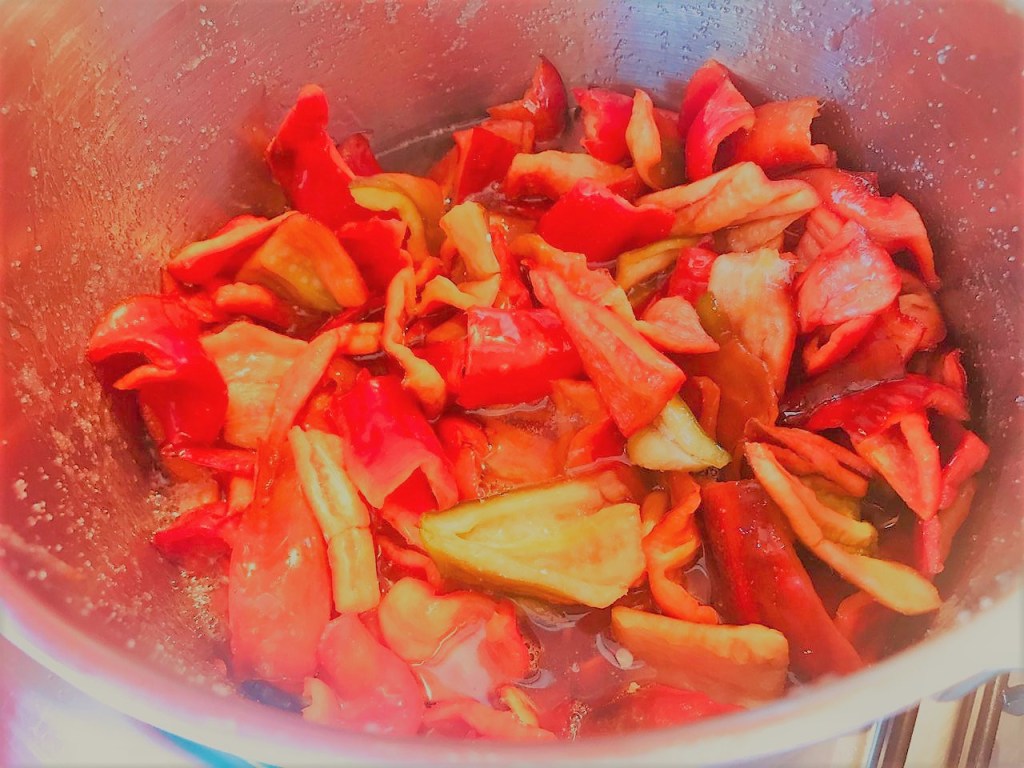 Numa panela misturar os pimentos cortados com o açucar e o vinagre, deixar ferver em lume baixo e mexer de vez em quando. Está pronto quando atingir o ponto de compota.