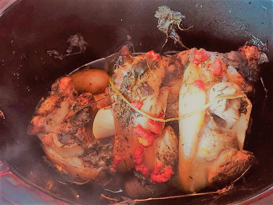 Colocar o azeite no fundo da panela, depois as cebolas às rodelas, de seguida as batatas cortadas como quiser, colocar o pernil e os restantes temperos. Ligar a panela no máximo e deixar entre 6/8 horas.