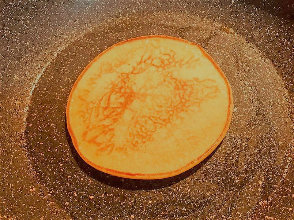 Numa frigideira antiaderente, untada com manteiga, verta uma colher de sopa de massa na frigideira e espalhe ligeiramente a massa.