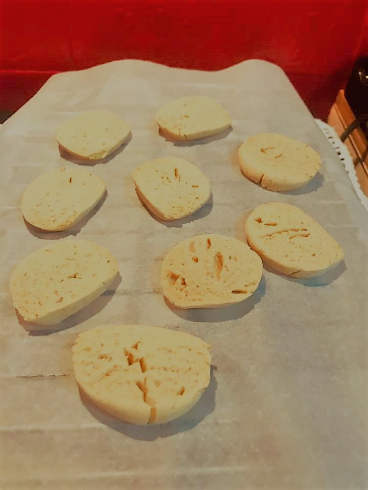 Retirar a massa do frigorifico e na bancada polvilhada de farinha fazer um rolo (como um chouriço) e cortar às rodelas.