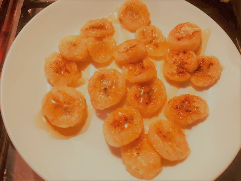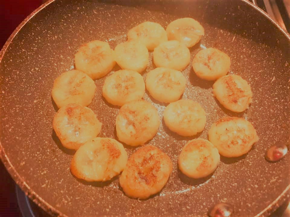 À parte fritar rodelas de banana com um pouco de manteiga, deve deixar tostadinha.