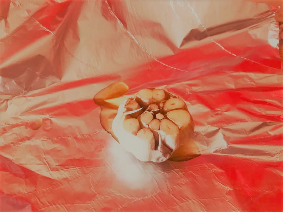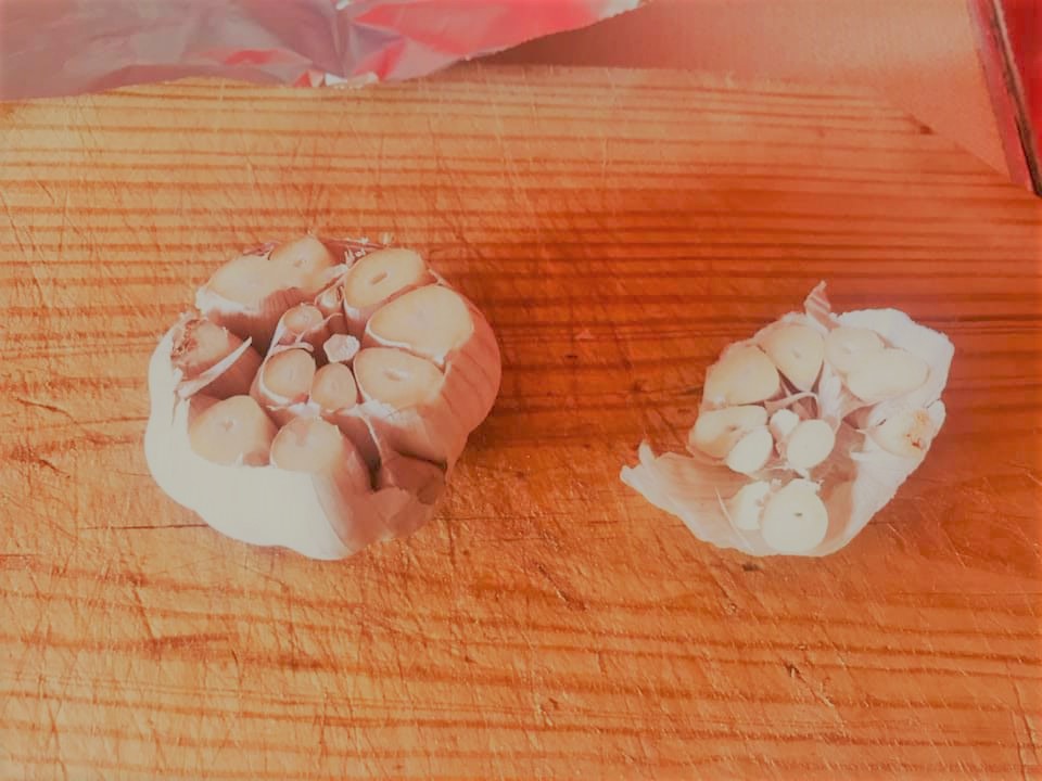 Primeiro asse o alho. Corte a parte de cima da cabeça de um alho inteiro e coloque em papel de alumínio com algum azeite. Embrulhe no alumínio e leve ao forno por cerca de 30 minutos.