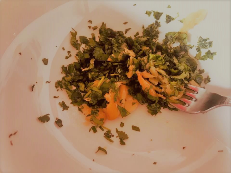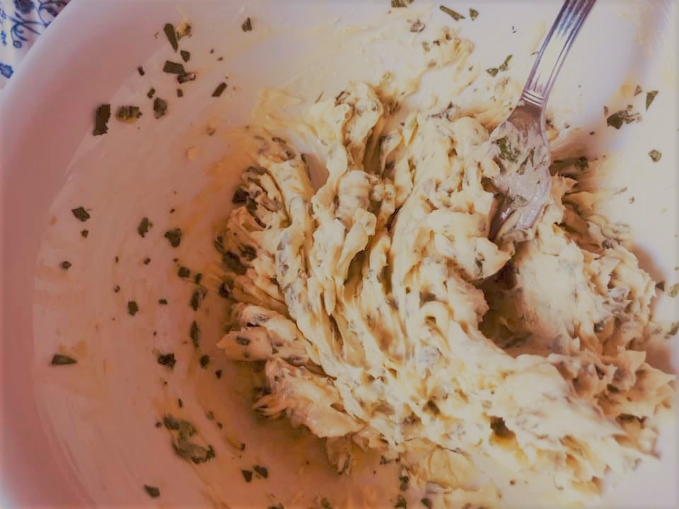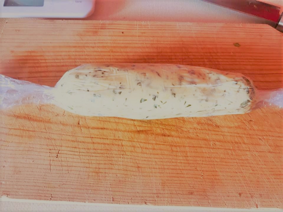 Mexa muito bem com um garfo para incorporar os ingredientes. Coloque esta manteiga em plástico filme e embrulhe em formato de chouriço e leve ao frigorifico algumas horas.
