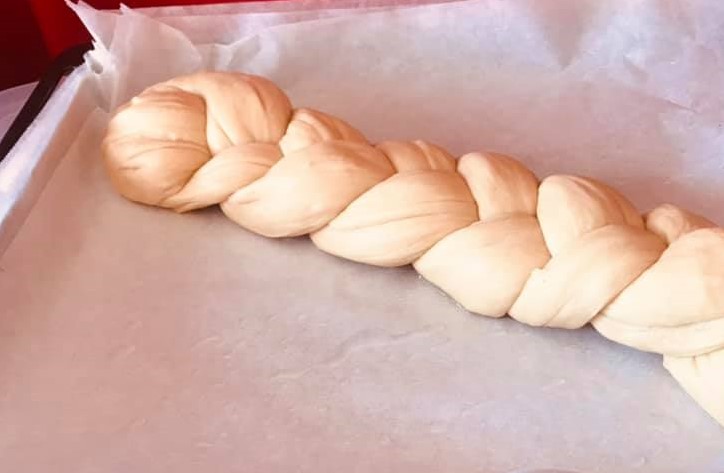 Pique a massa (isso remove as bolhas de ar) e coloque no balcão. Use o cortador para dividir a massa igualmente em seis seções. **** Enrole cada seção em um cordão de cerca de 30 a 15 centímetros de comprimento. Trance dois pães de 3 cordas. ***** Coloque os pães em uma assadeira untada com óleo e cubra com um pano de prato. Deixe a massa crescer até que os pães dobrem de tamanho por cerca de 60 minutos.