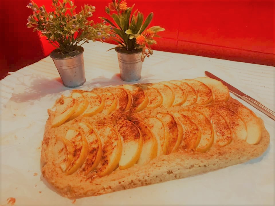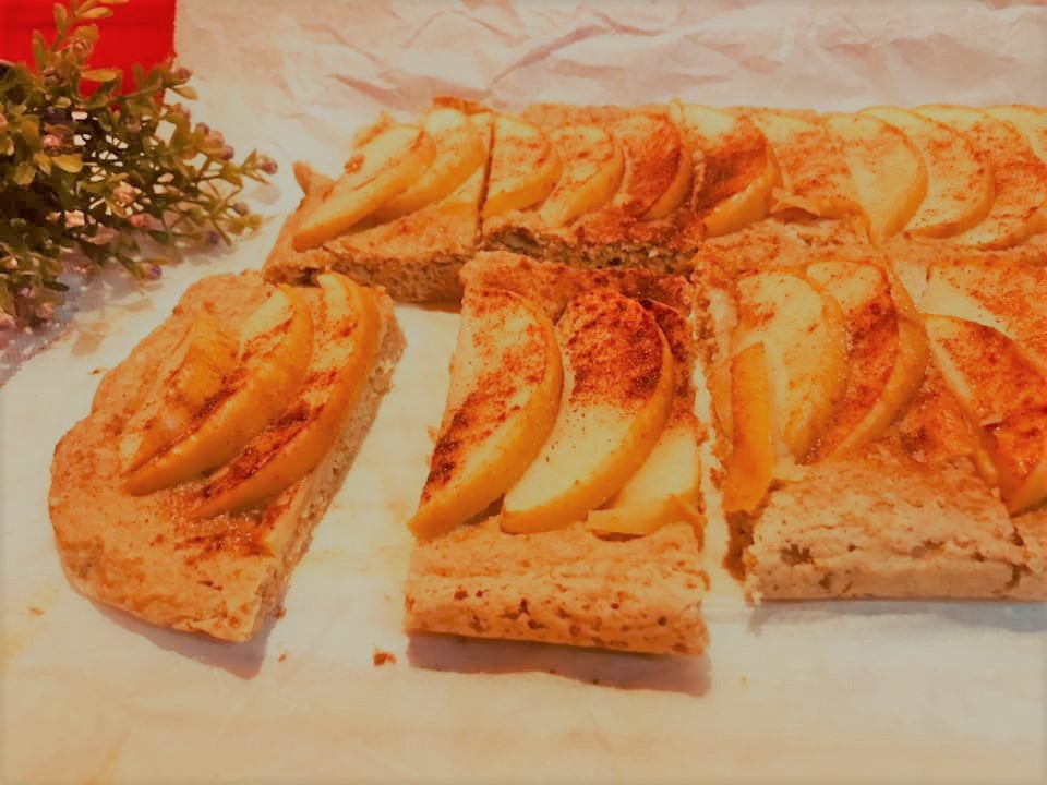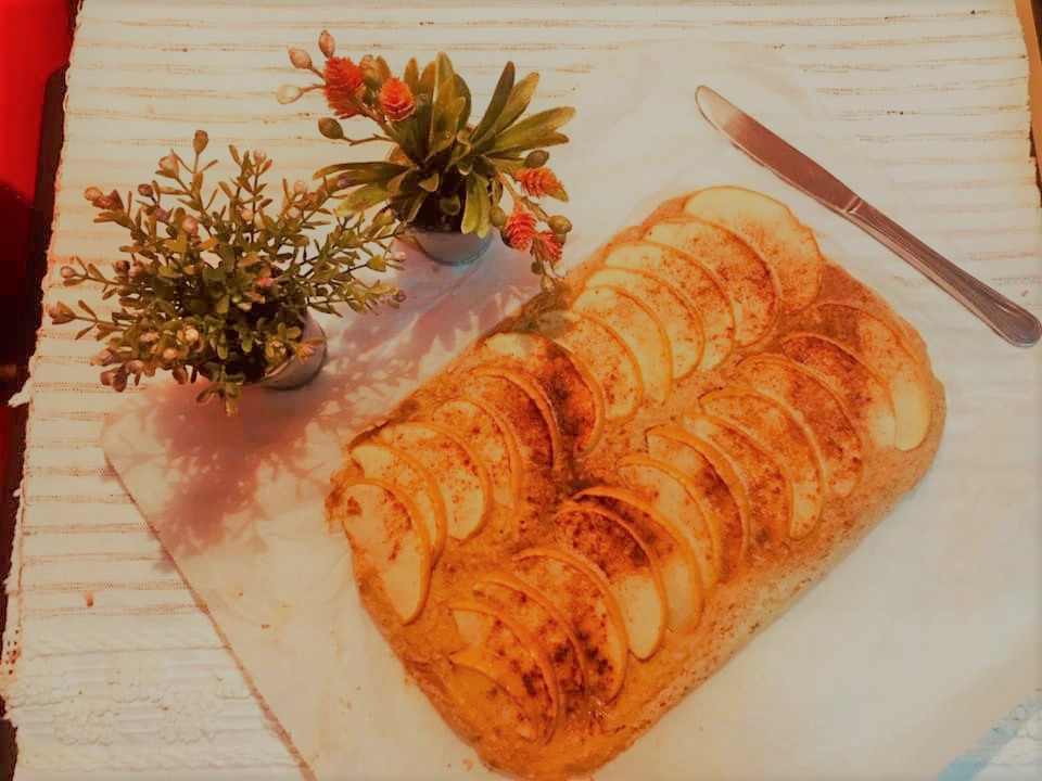 Triture a maça sem a casca e a banana, acrescente os ovos. A esta misture junte os restantes ingredientes. Leve a uma forma quadrada forrada com papel vegetal e ppr cima coloque a maçã partida em fatias finas (meias luas) e polvilhado com canela (os mais gulosos podem espalhar açucar). Leve ao forno pé-aquecido a 180 graus durante 30 minutos.