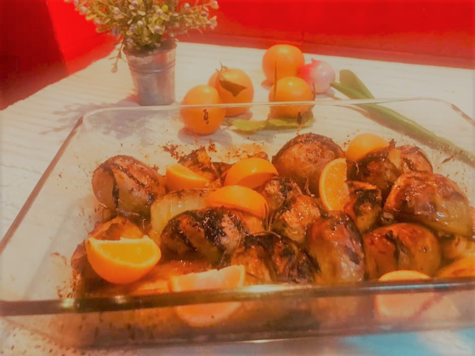 Numa assadera deitar um fio de azeite, a cebola partida e as batatas. Agora temperar com os restantes ingredientes e colherinhas de banha de porco e regar com o sumo da tangerina. Deixar no forno a 200 graus o tempo que achar necessário!