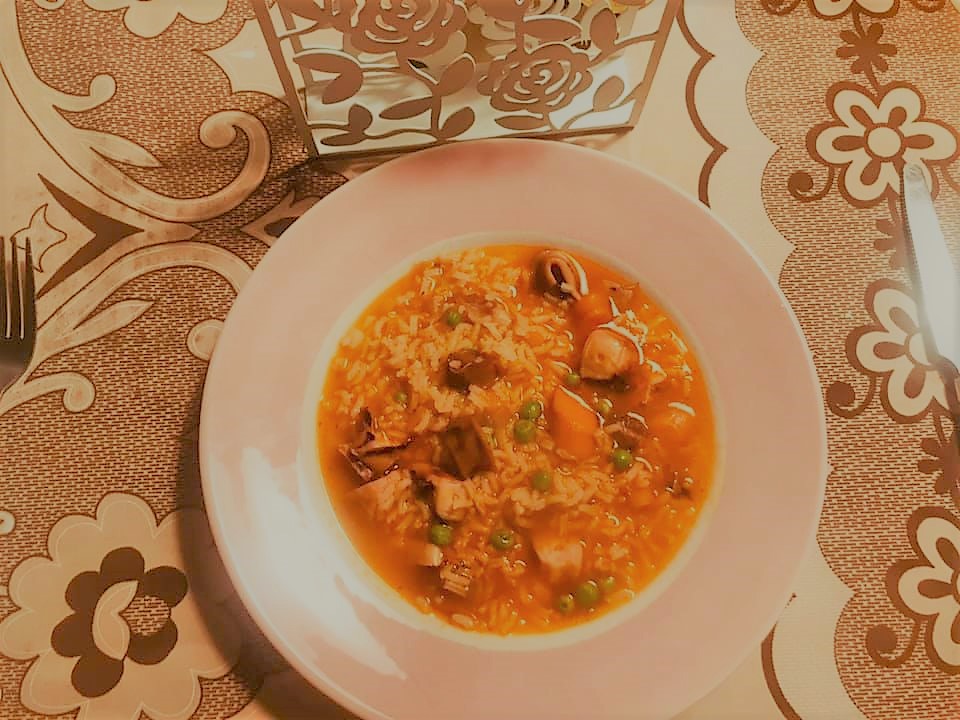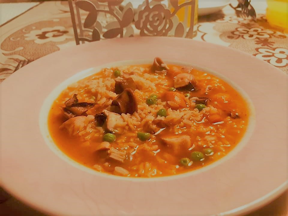Faz-se um refogado como de costume para fazer o arroz, com azeite e cebola. Deita-se a água e deixa-se ferver, a seguir o arroz e deixa-se ferver. Quando estiver quase pronto acrescentam-se os enlatados e as ervilhas. Deixar ferver mais um minuto e retificar o tempero a gosto.