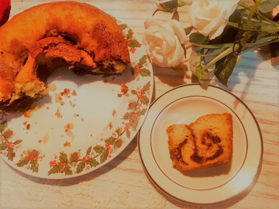 Numa forma untada de manteiga e polvilhada de farinha colocam-se porções de massa ao sem o cacau e porções intercaladas de massa de cacau. Com a ponta de uma faca mexa um pouco para fazer os feitios.