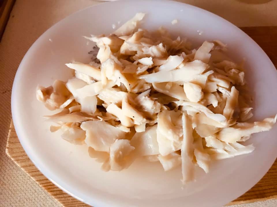 Retire as pele e espinhas do bacalhau e separe em lascas.