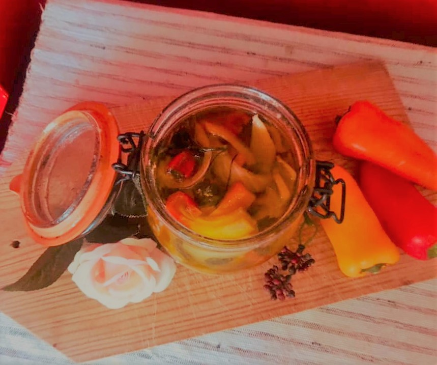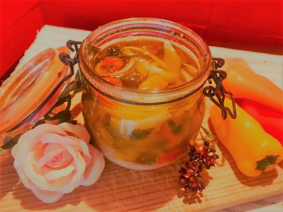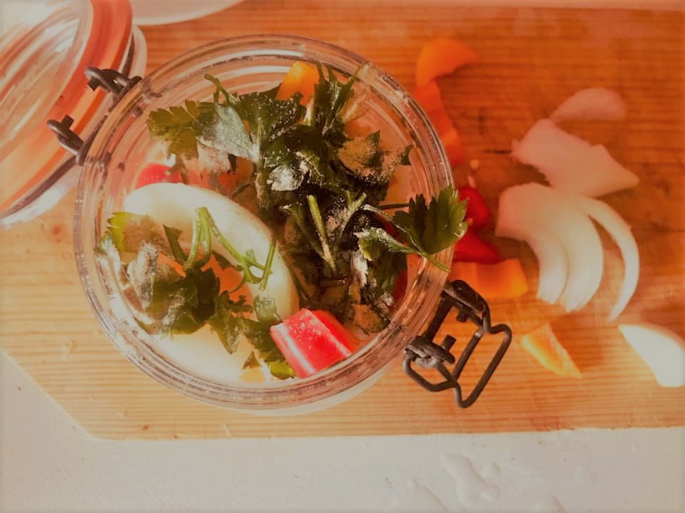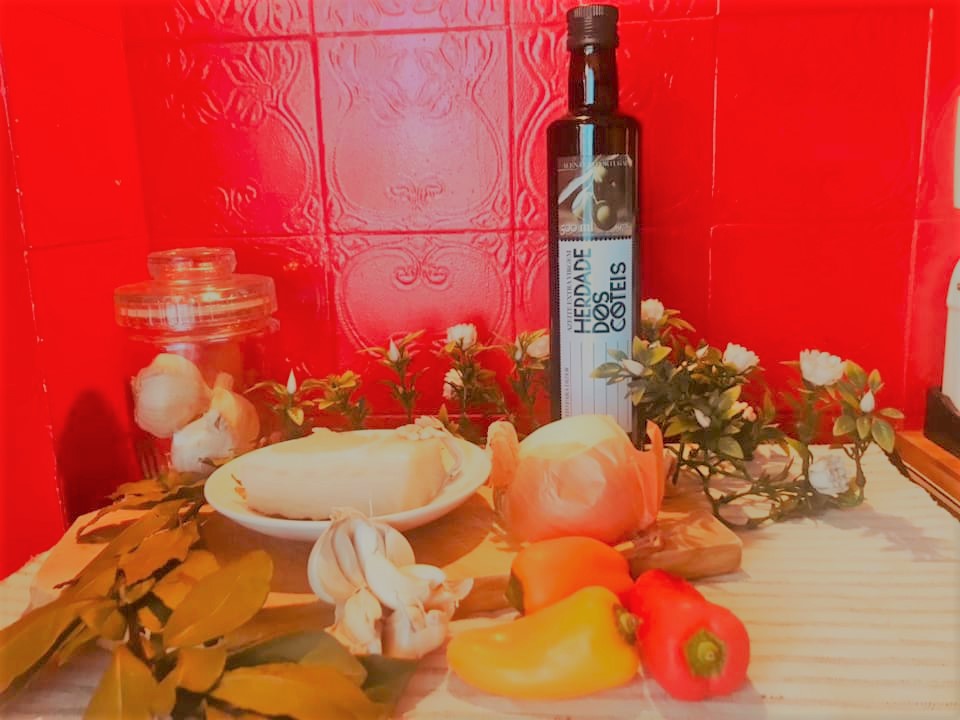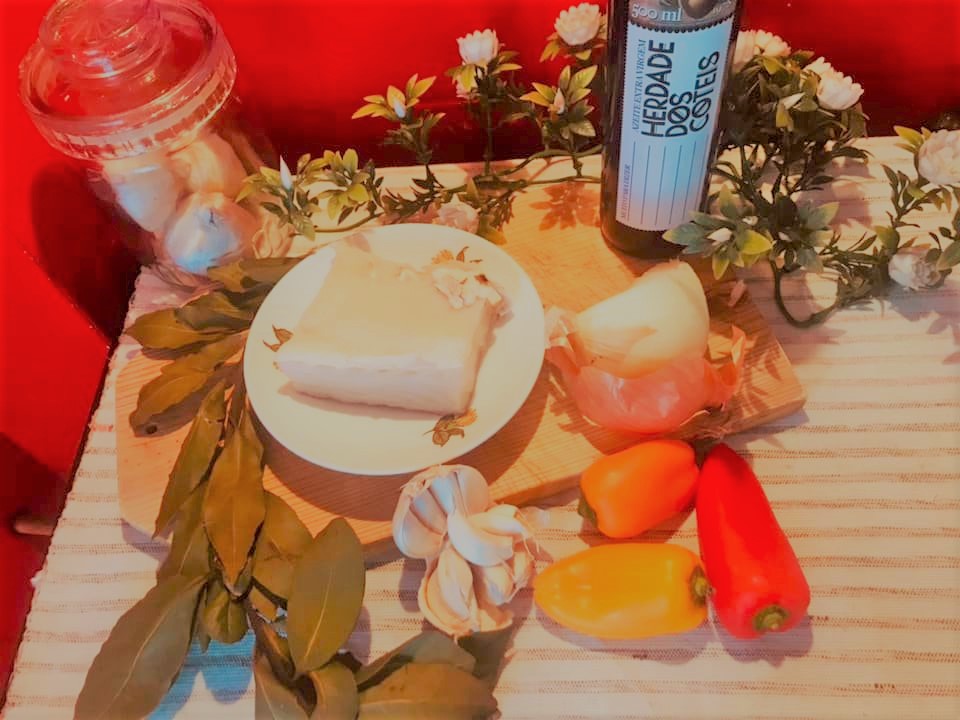 Deve pegar em uma posta de bacalhau demolhada e descongelada e partir em bocados (livre de pele e espinhas). Alternadamente no pote coloque todos os ingredientes. Cubra com azeite o pote, vá deitando devagarinho e com ajuda de uma faca fazer com que o azeite penetre por entre os alimentos retirando o ar que contenha.