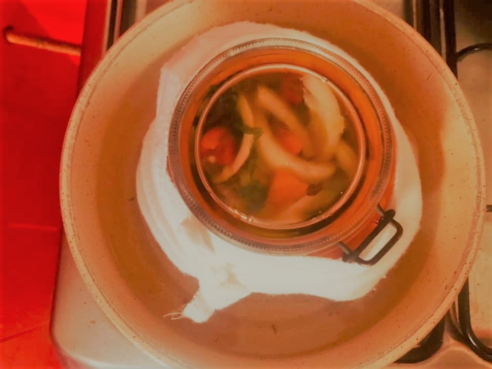 Feche e envolva num pano de cozinha. Leve a uma panela e cubra com água até dois terços do pote. Deixe ferver em fogo lento durante cerca de 1h30m. Deixe esfriar e meta no frigorífico.