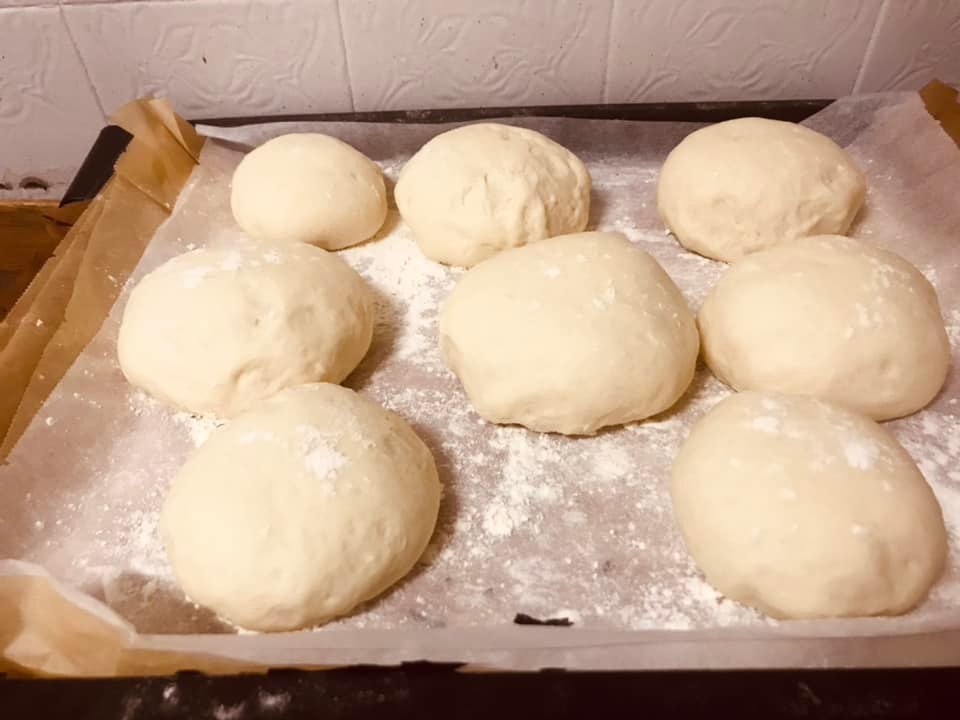 Deve numa bancada enfarinha fazer um rolinho e cortar 10 pedaços iguais. Pegue em cada pedaço e dobre de modo a puxar os quatro cantos para dentro, de modo a formar uma bolsa de ar e enrole na mesa a bolinha. Deve tapar as bolinhas com um pano de cozinha e deixar por uma meia hora, vão crescer um pouco.