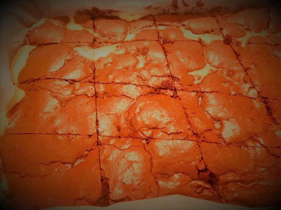 Numa forma quadrada ou retangular e forrada com papel vegetal despeje metade da mistura do brownie, por cima a mistura do cheesecake e finalize com o restante brownie.