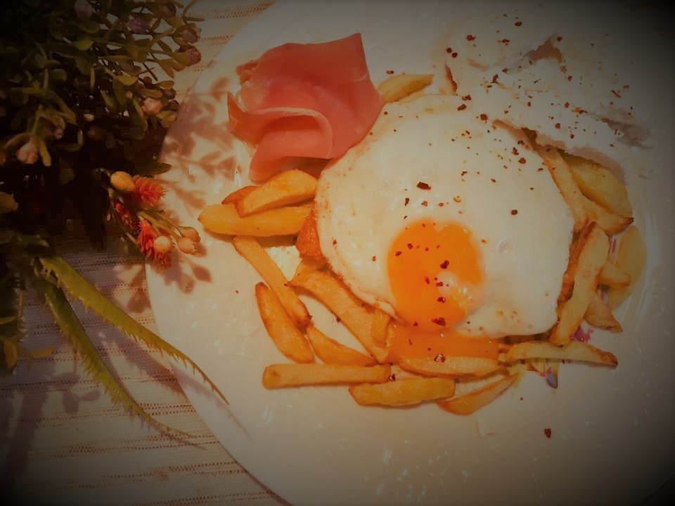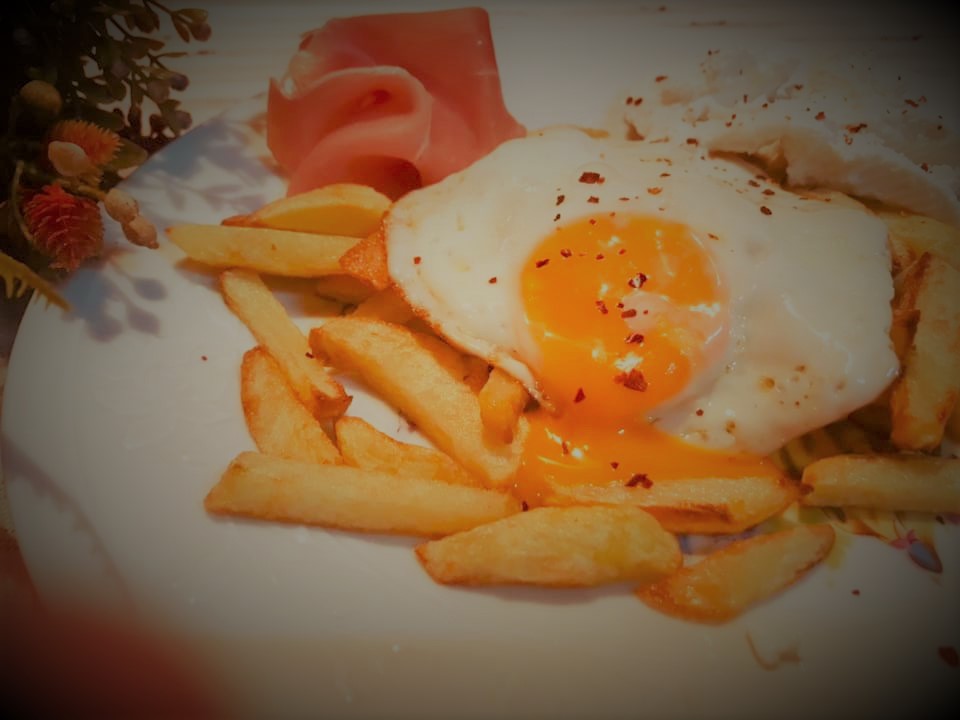 Para fazer esta receia use as quantidades adaptadas para o número de pessoas em questão. Frite as batatas aos palitos (eu frito na air fryer), tempere com sal e disponha num prato. Frite os ovos mal fritos e coloque por cima das batatas. Coloque no prato as fatias de presunto e polvilhe com mistura de pimentas moídas.