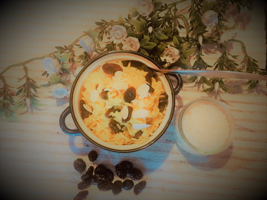 Num tacho deite um fio de azeite e a cebola picada e deixe alourar a cebola, juntando o sal e o açafrão. Deite o arroz e as passas e deixe fritar um pouco. A seguir deite a água a ferver e deixe cozinhar. Quase a acabar deite as amêndoas e mexa o arroz e desligue.