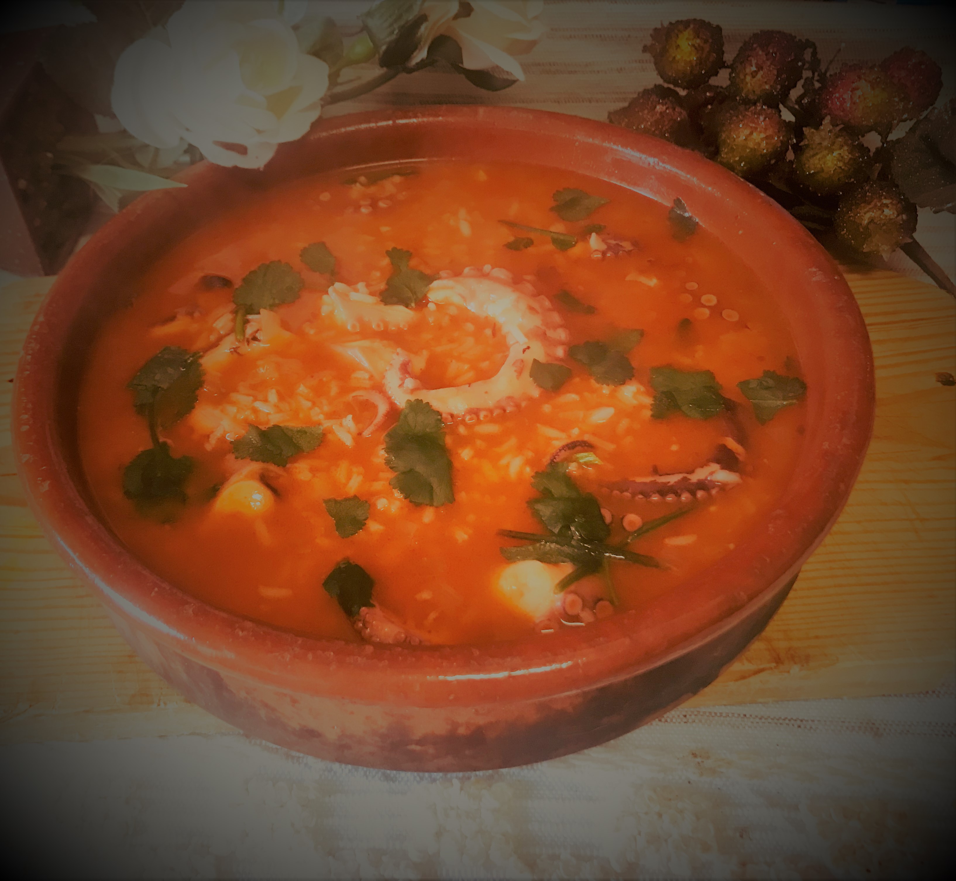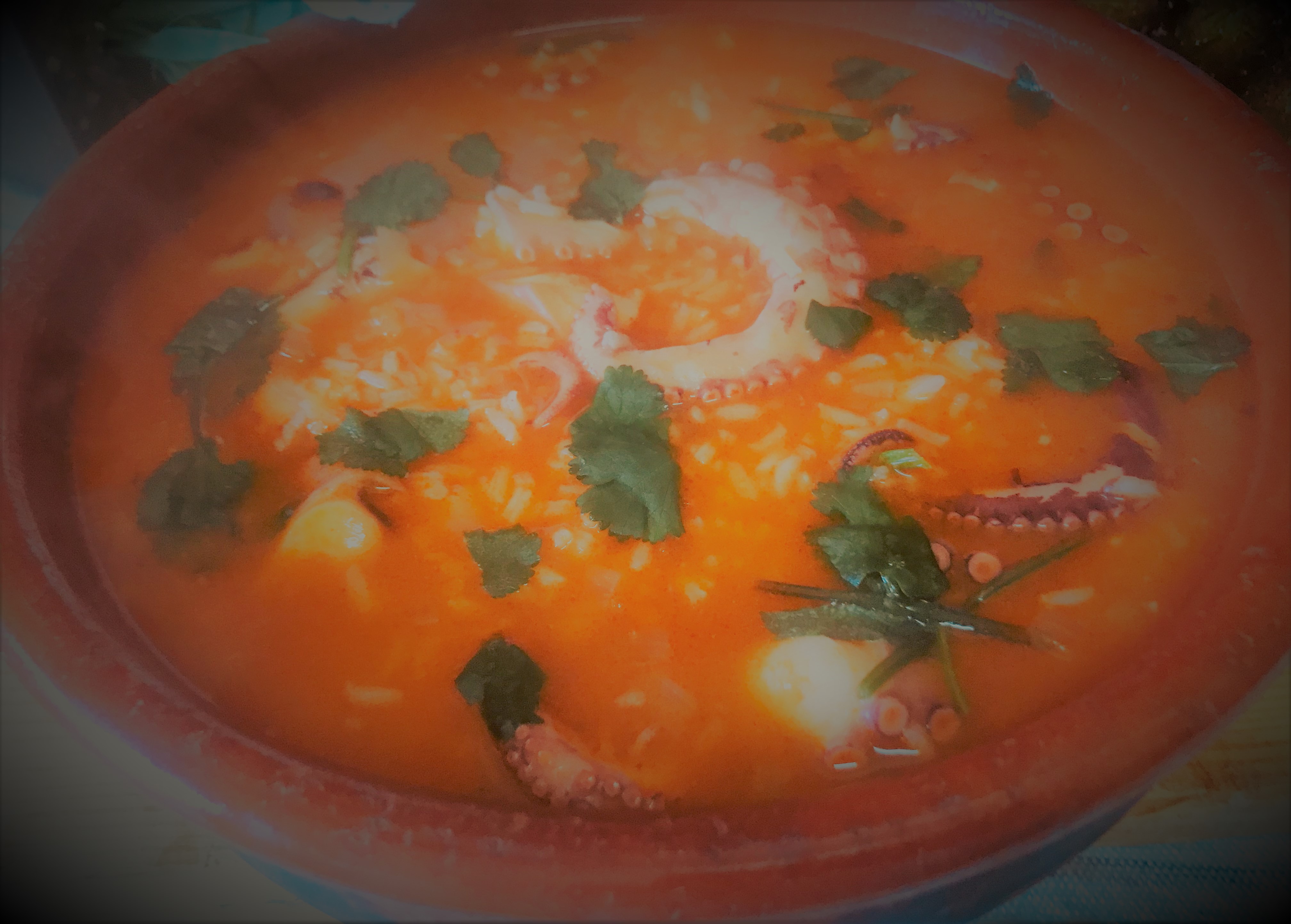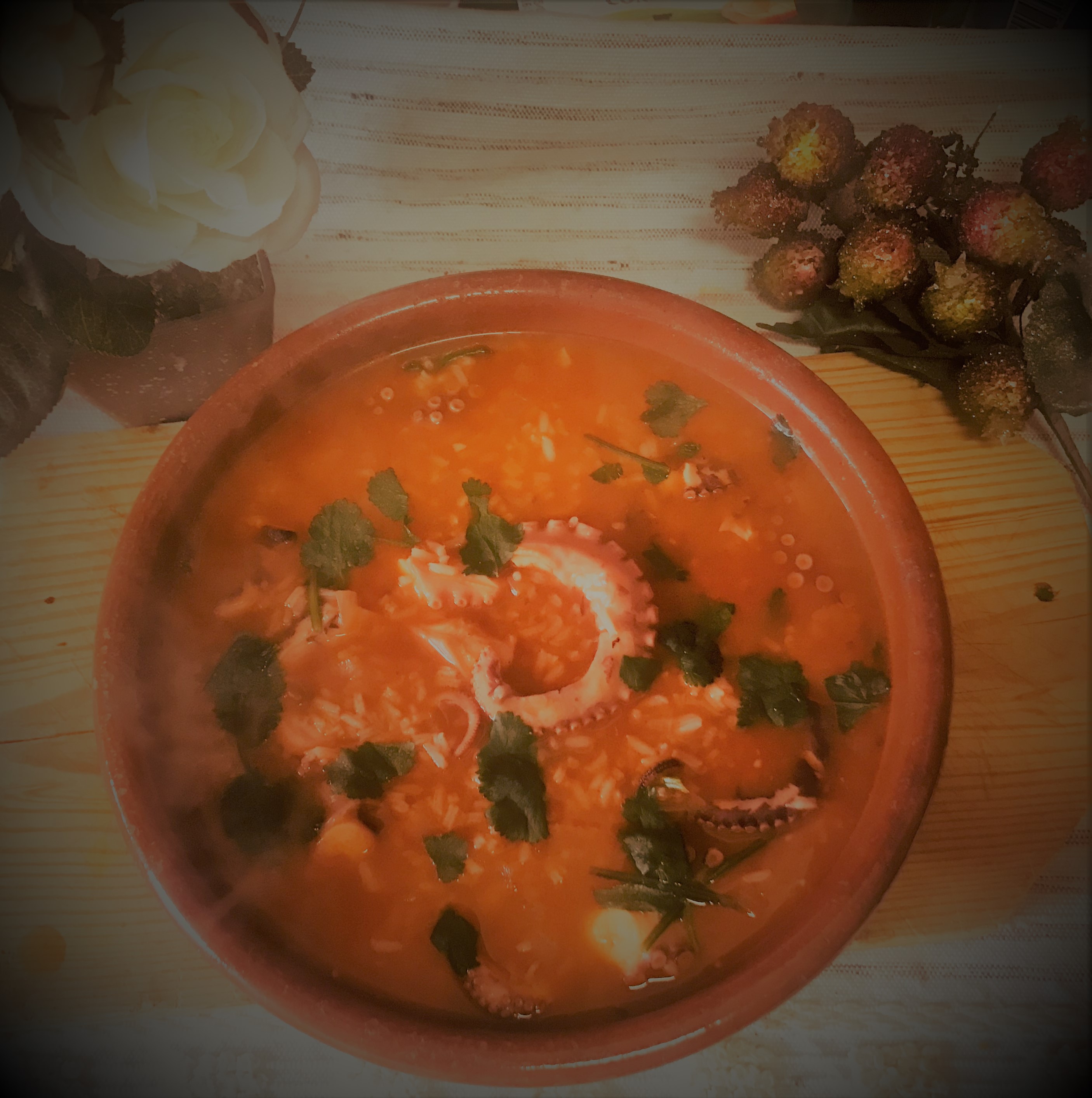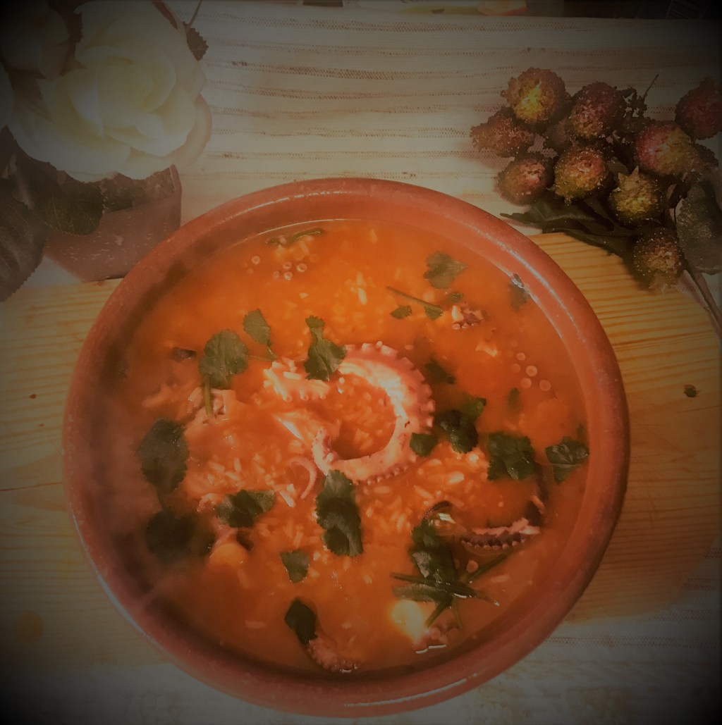 Num tacho leve um fio de azeite, a cebola cortada e o alho esmagado. Adicione o tomate cortado aos cubinhos e os restantes temperos e deixe cozinhar até o tomate estar frito. Acrescente a água de cozer o polvo em quantidade suficiente. Introduza o arroz e o polvo cortado aos bocadinhos. Deixe cozinhar até o arroz estar cozido. Regue com o sumo de limão e introduza os coentros picados.