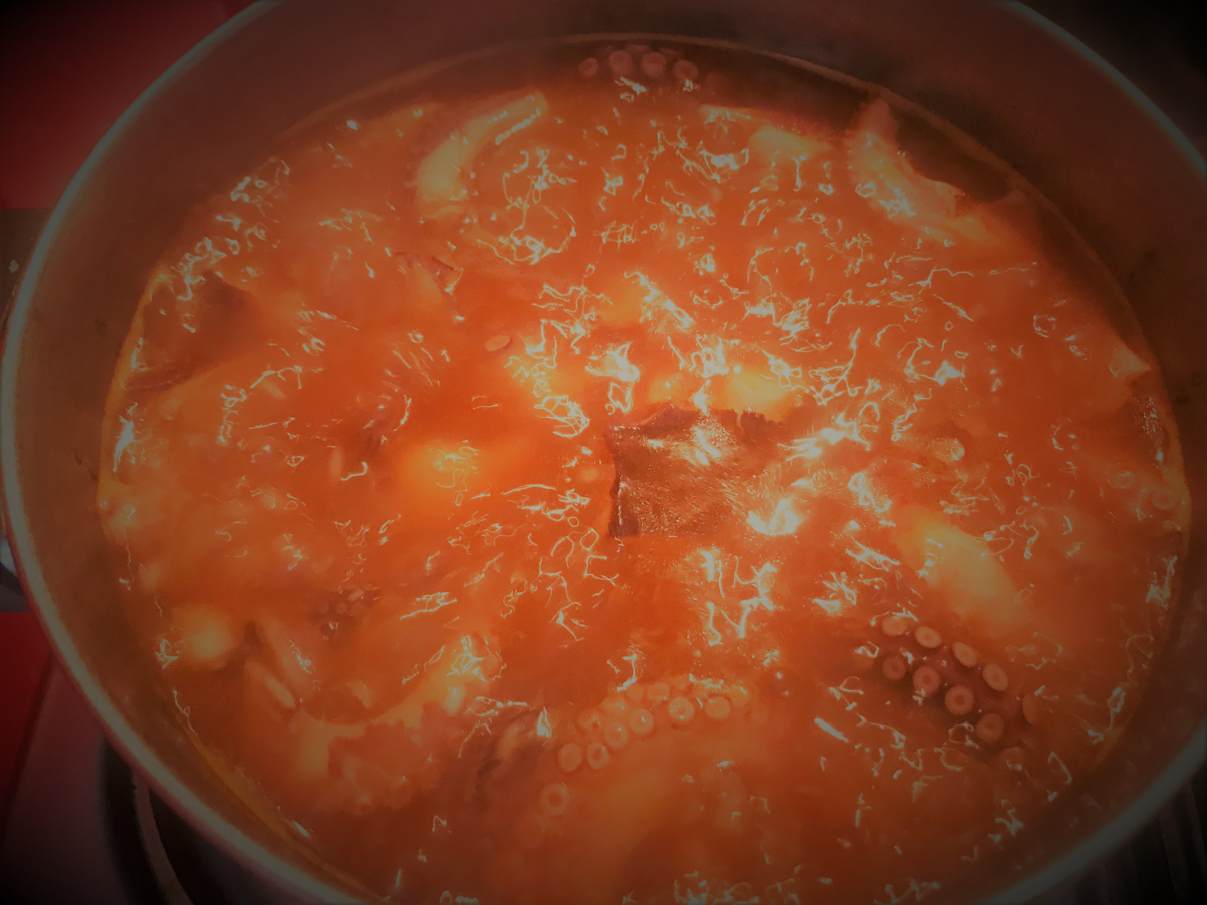 Leve o polvo a cozer durante cerca de meia-hora, leve a um tacho congelado e mergulhado em água. Reserve a água de cozer.