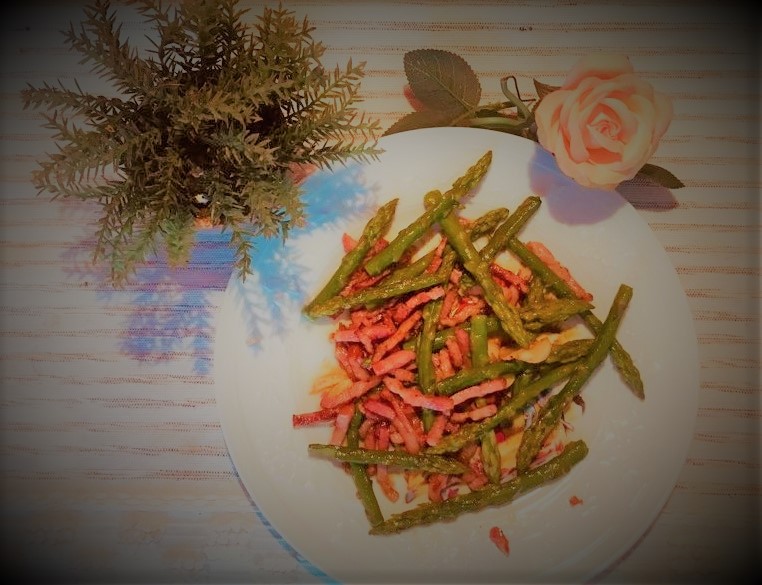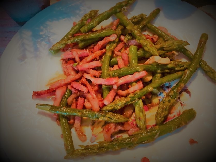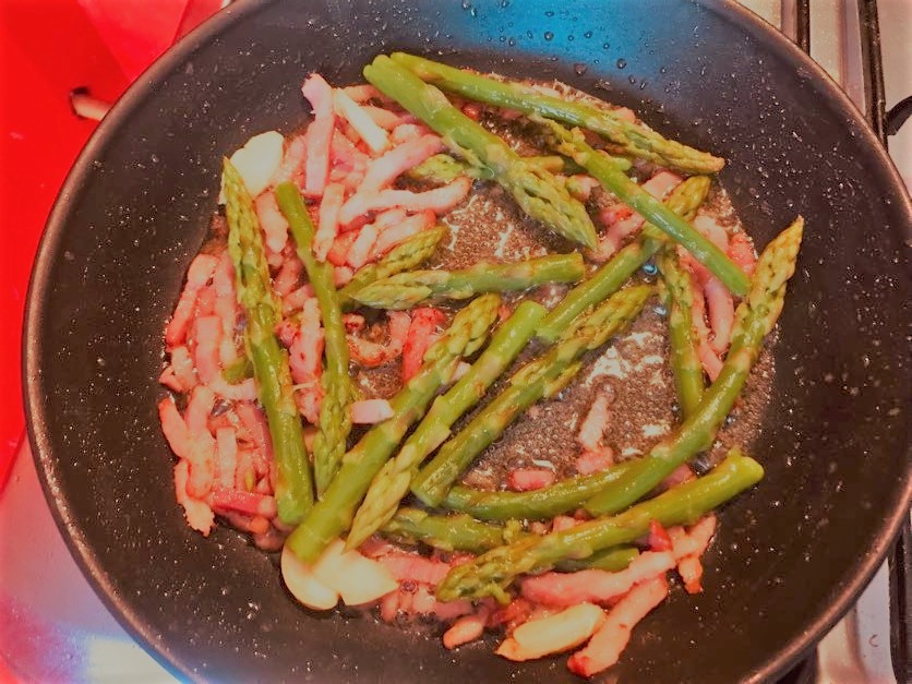 Numa frigideira deite uma noz de manteiga e coloque os espargos, agitando a frigideira bem. Ciolouqe a pasta de alho e deite de seguida o bacon partido aos bocadinhos. Coloque um pouco de água (este é um segredinho que aprendi com a Clara de Sousa) e continue a agitar. Deite sal e pimenta a gosto (mas tenha em atenção que o bacon é salgado).