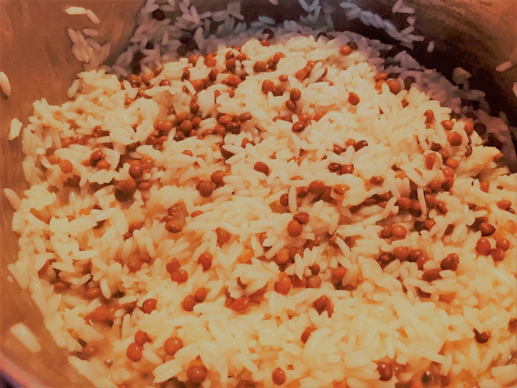 Deve colocar o azeite a cebola bem picadinha na panela e deixar refogar, colocar o cubo de caldo de galinha e mexer bem para desfazer. Colocar o arroz e deixar “fritar” um pouco. Colocar os copos de água a ferver e deixar cozinhar em lume brando. Quando a água quase evaporar, deitar as lentilhas e mexer. Deixar mais um minuto ao lume.