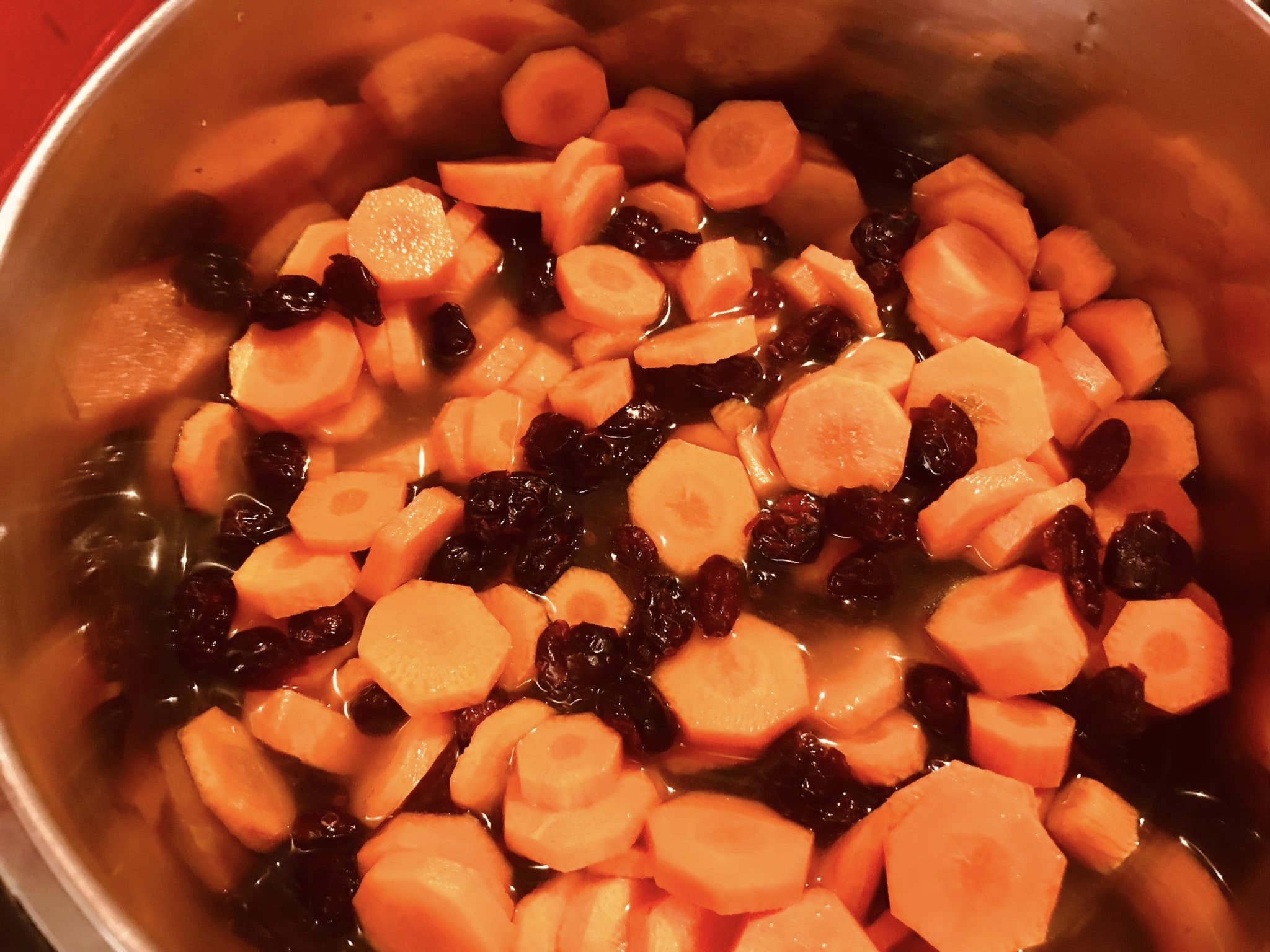 Numa panela coloque a manteiga, as cenouras às rodelas e acrescente o mel. Cubra com água e deixe cozinhar durante cerca 20 minutos ou até que a água evapore, mas não demasiado. Acrescente as uvas passas e cozinhe por mais 10 minutos.