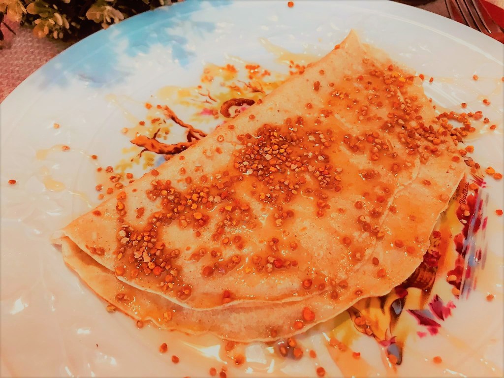 Triture todos os ingredientes, exceto o mel e pólen e distribua uma concha de massa numa frigideira anti aderente. Quando os lados começarem a ficar secos, vire o crepe de deixe cozinhar um pouco. Retire e distribua o mel por cima e o pólen, a gosto.