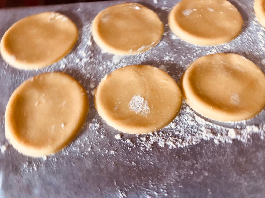 Bater bem a manteiga com o açúcar, acrescentar o ovo, a baunilha e as raspas de limão e bater. Depois deve acrescentar a farinha e o leite e bater pouco só para misturar os ingredientes. Amassar um pouco à mão.