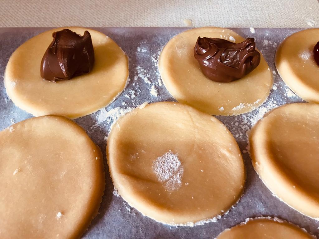 Deve abrir a massa com um rolo e deixar numa espessura fina de milímetros. Cortar com a boca de um copo ou um cortador redondo e rechear com o que quiser (nutella, compotas…). no meio e fechar em forma de triângulo, vai a assar em forno pré-aquecido. Decorar com açúcar de confeiteiro.