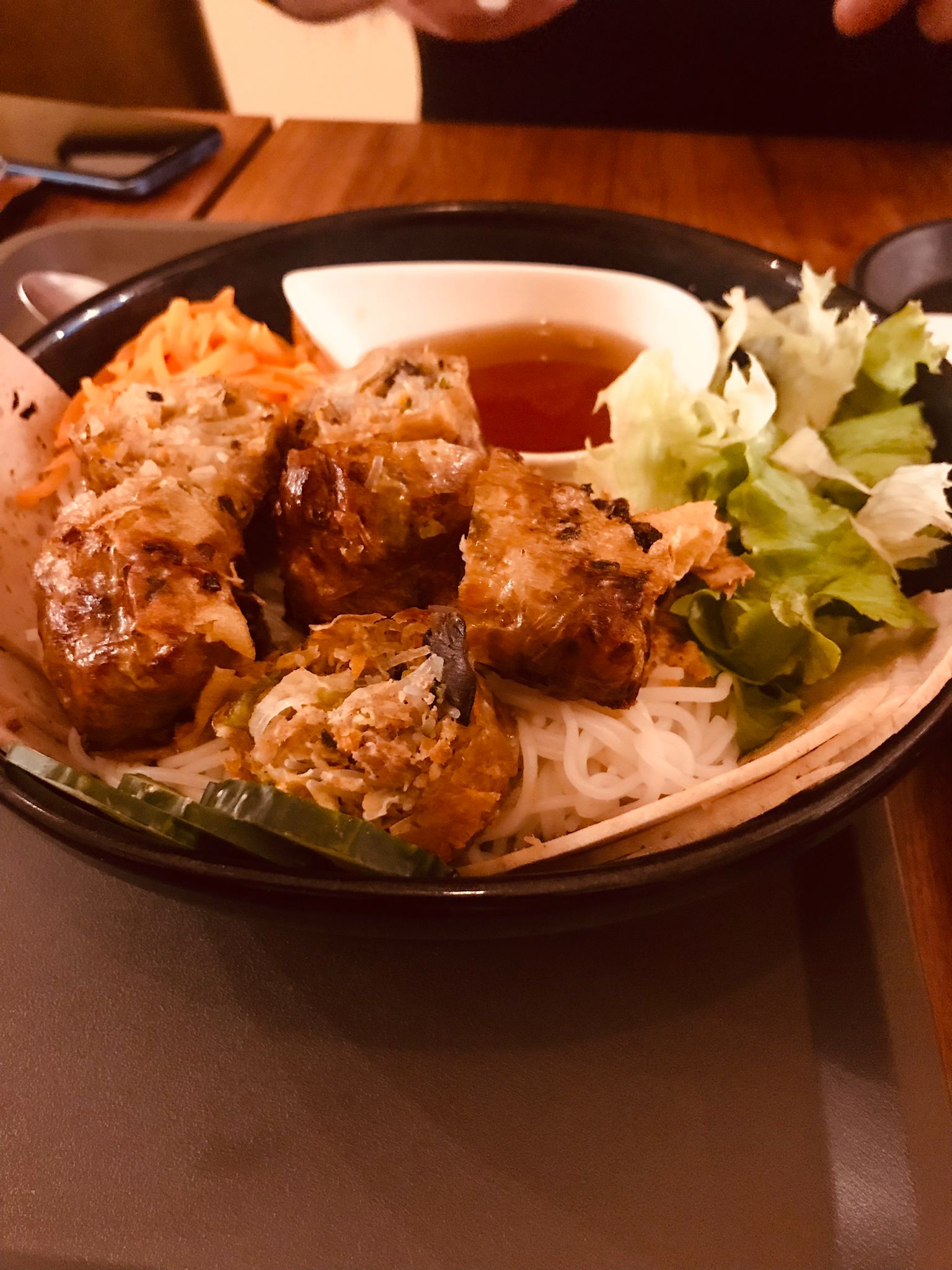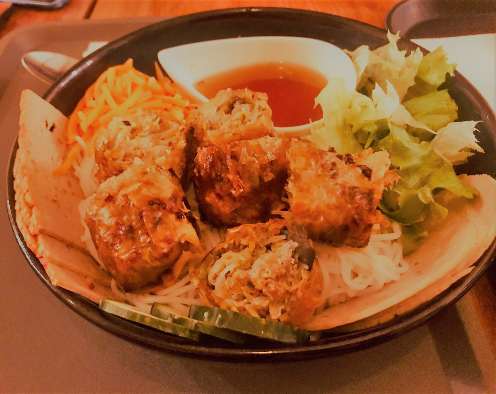Eu comi Bún Nem, uma mistura de arroz de noodles, com carne, cenoura, alface, pepino e um molho bem saboroso.