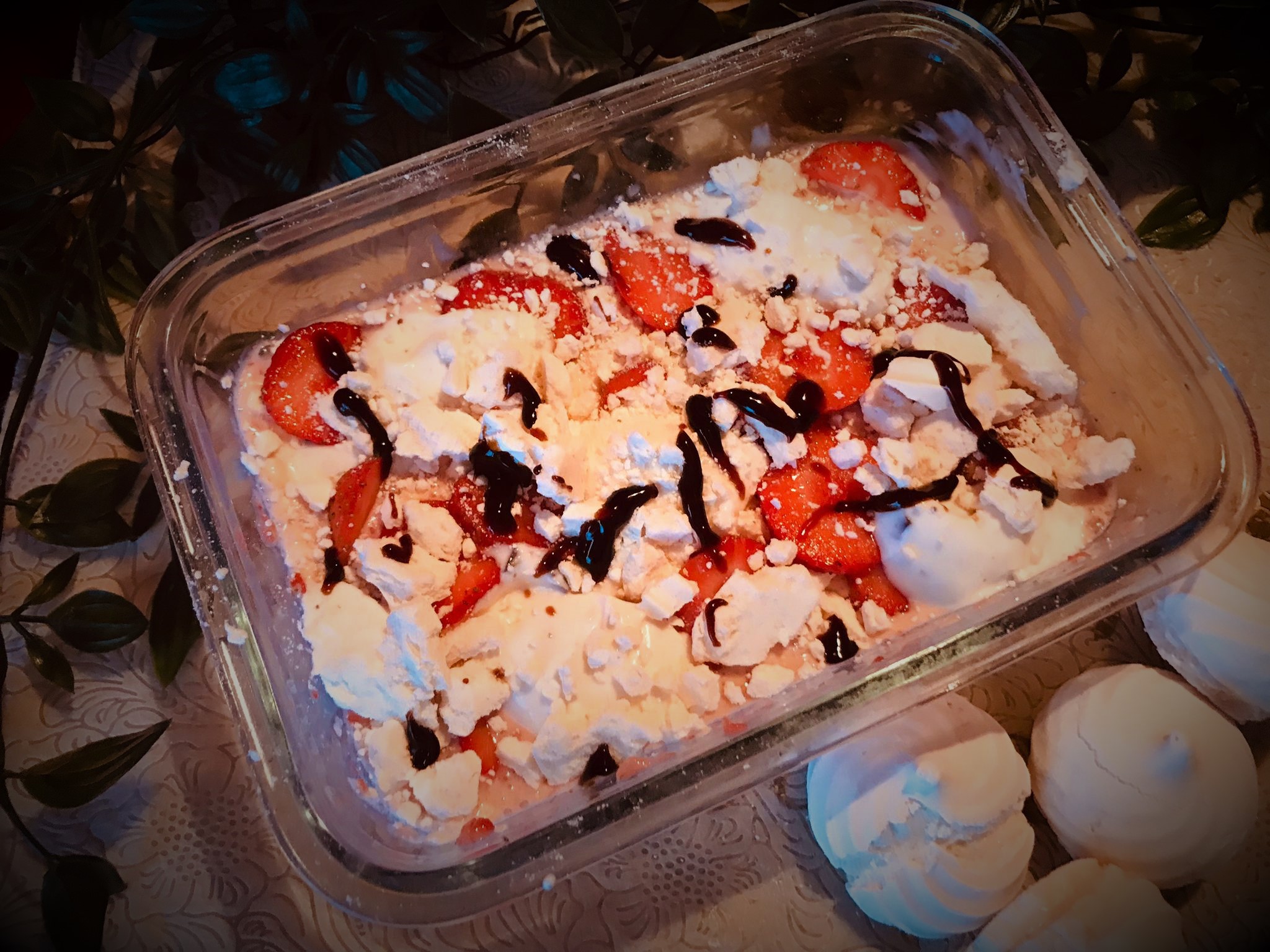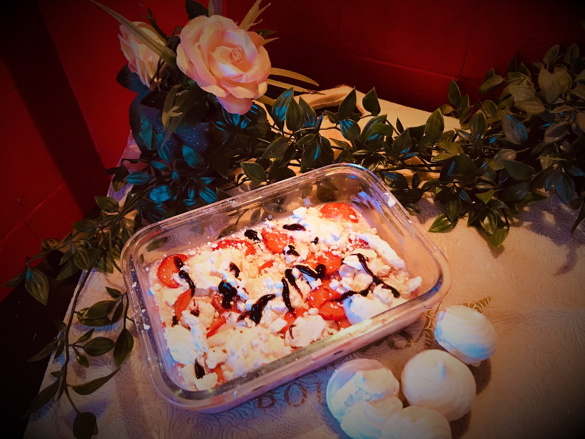 Por cima espalhe mais suspiros esmagados, morangos cortados e espalhe um pouco de vinagre balsâmico, consoante o gosto.