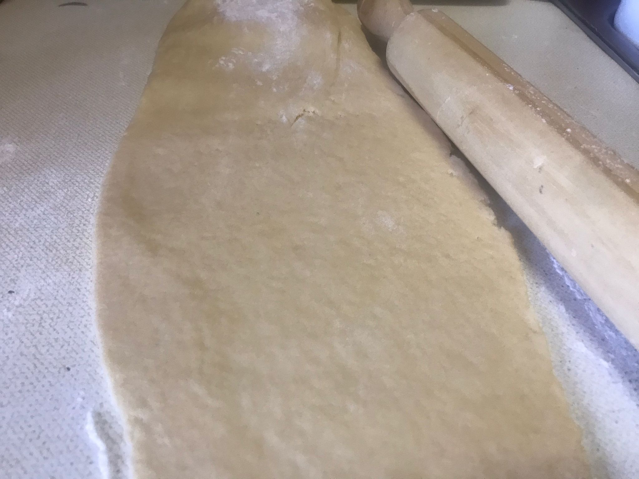 Em seguida, abra a massa com um rolo em uma superfície lisa e polvilhada com farinha, até que fique fina.