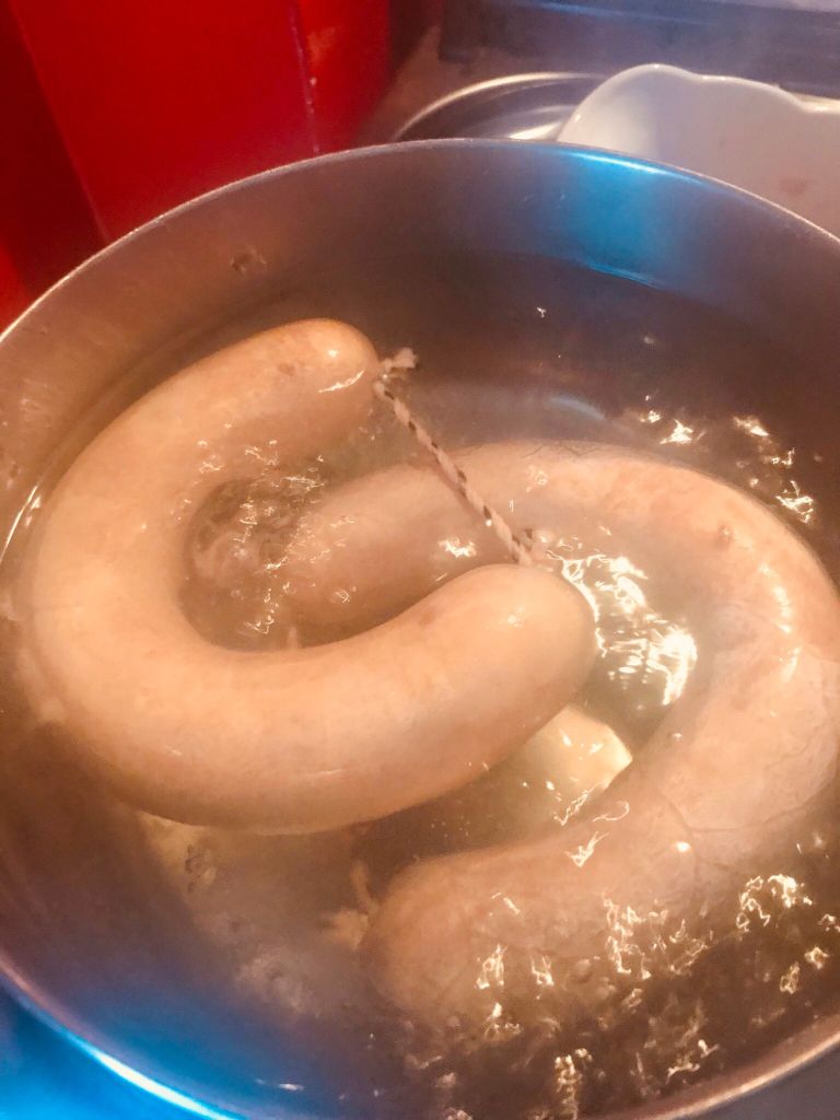 Coza as alheiras em água, retire a pele e desfaça-as com um garfo, transformando-as em pedaços menores.