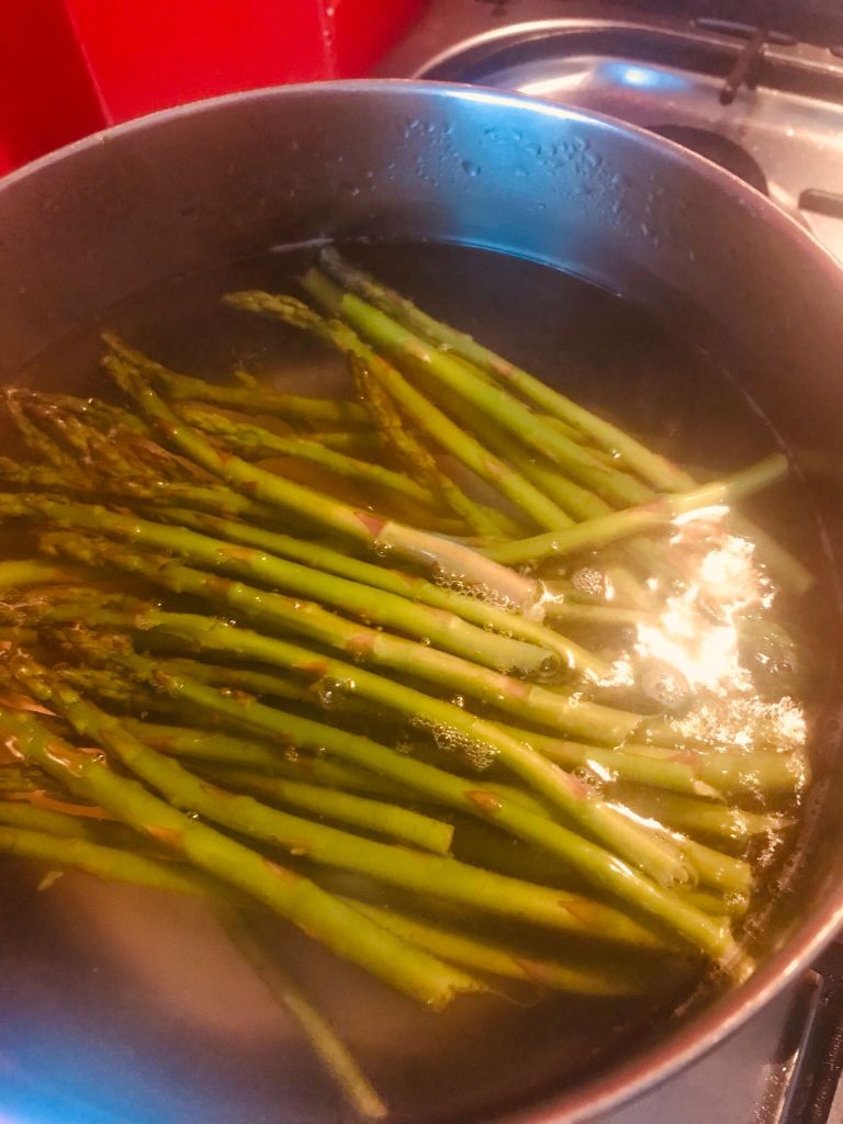 Em uma panela, ferva água e adicione uma pitada de sal. Cozinhe os espargos por cerca de 3-4 minutos, até que fiquem macios, mas ainda crocantes. Escorra e reserve.