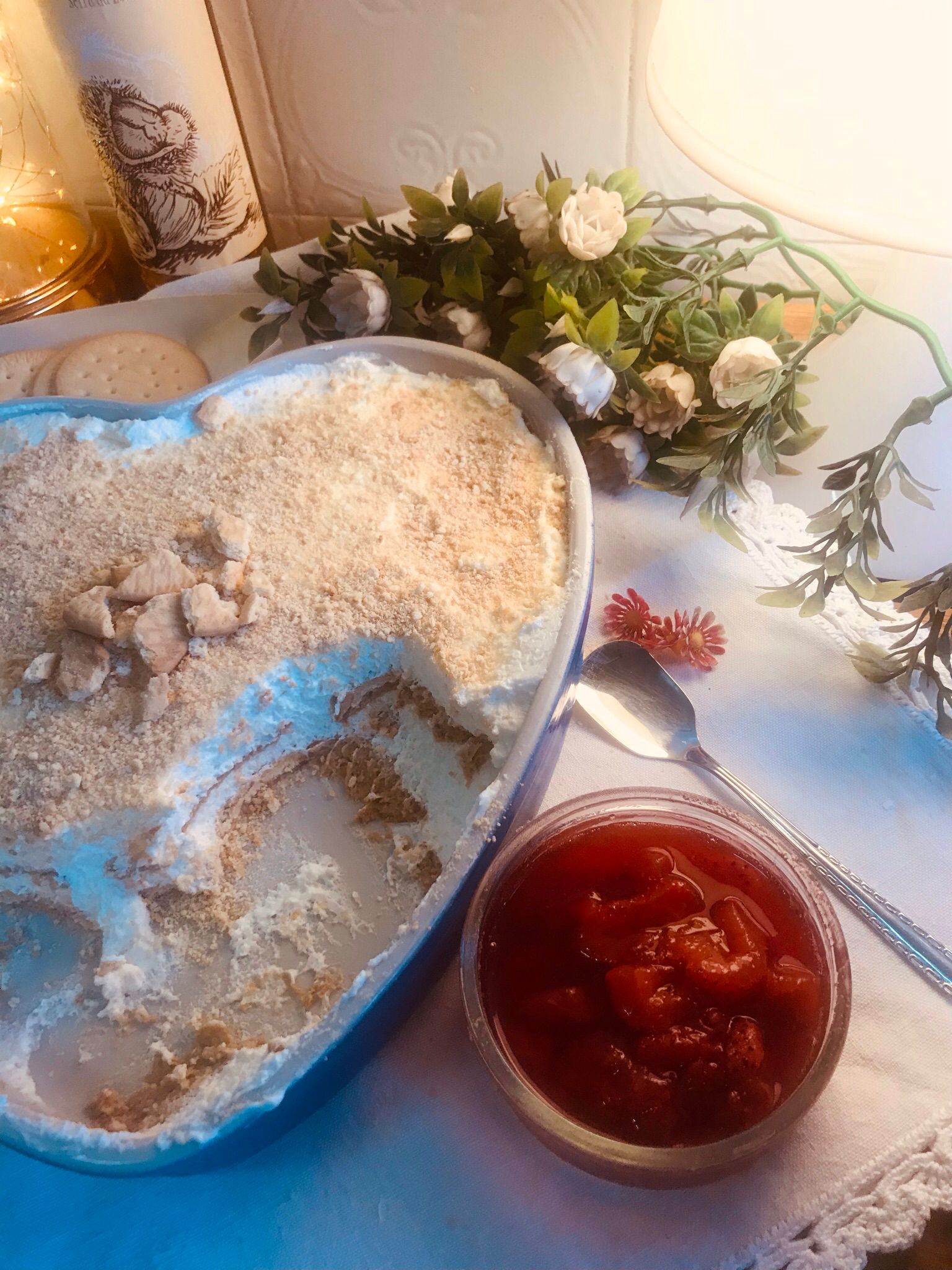 Espalhe as migalhas de bolacha sobre o creme de natas e mascarpone, criando uma cobertura crocante.