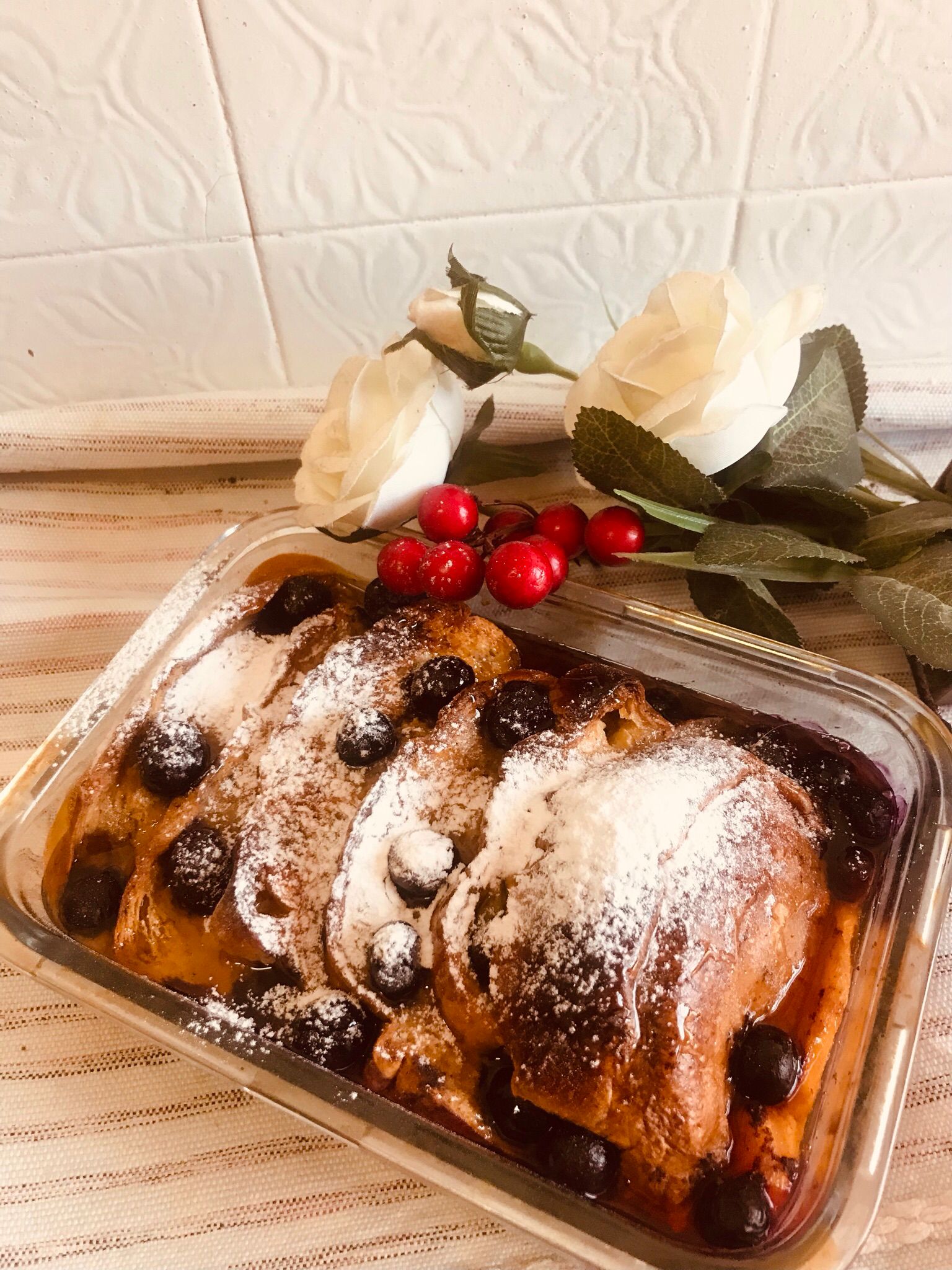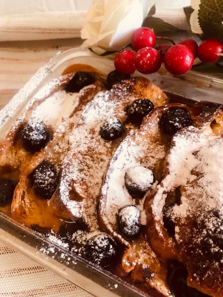 Sirva o French Toast de forno com pêssegos e mirtilos ainda quente, acompanhado de uma chávena de café fresco ou sumo de frutas.