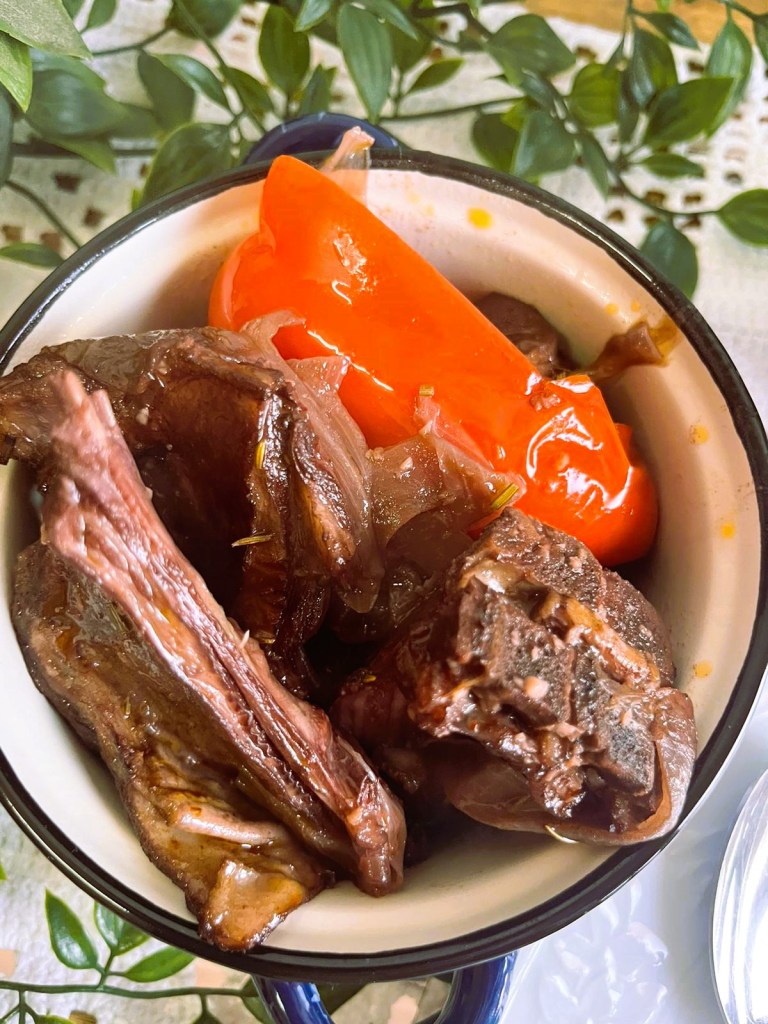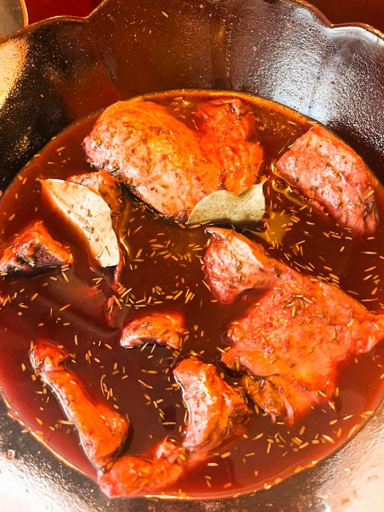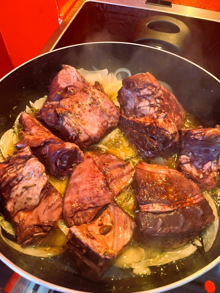 Um passo crucial na preparação da minha chanfana é deixar a carne a marinar durante uma noite em vinha d’alhos. Este processo permite que os sabores se infiltrem na carne, resultando num prato ainda mais rico e apetitoso.