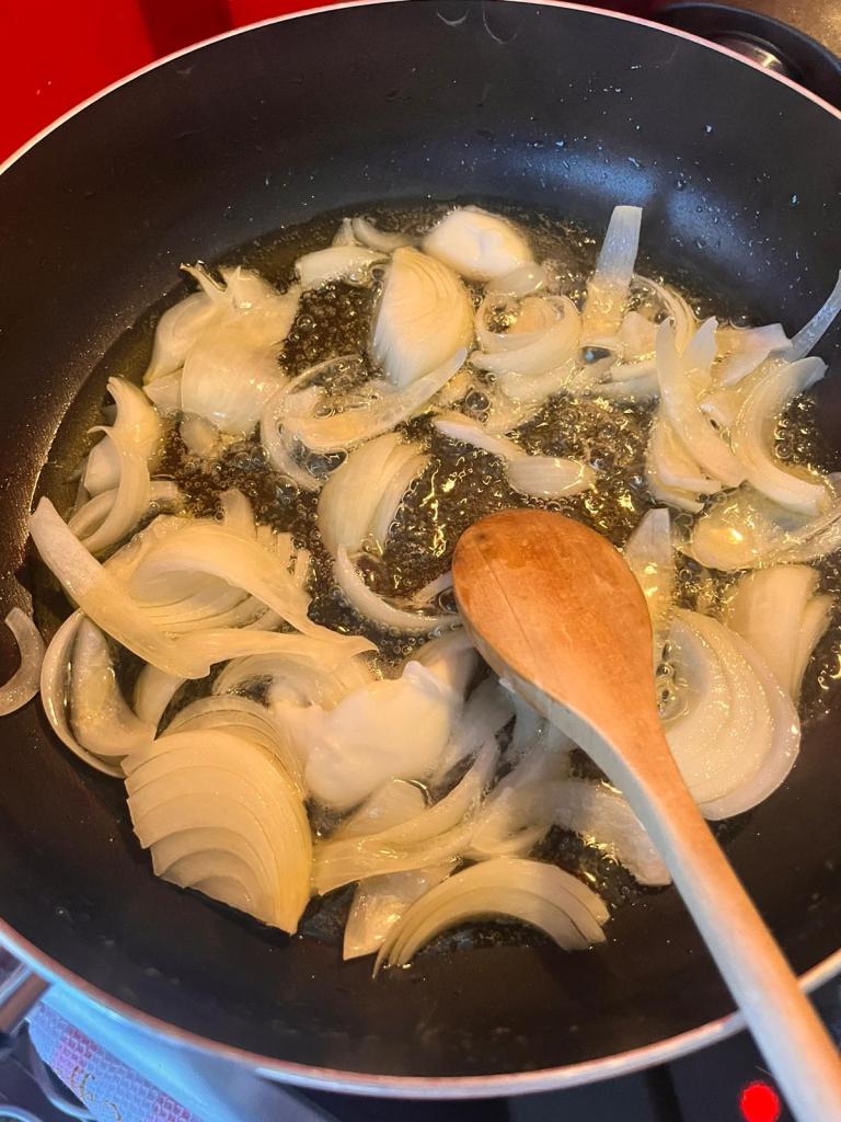 - Num tacho ou panela grande, aqueça um pouco de azeite e banha de porco. Adicione as cebolas cortadas em rodelas e deixe-as alourar.