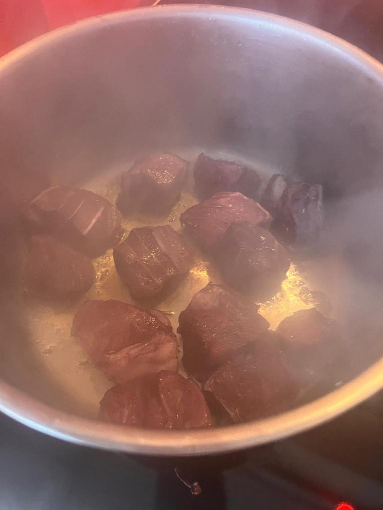 Na mesma panela, adicione os cubos de carne, garantindo que cada pedaço esteja dourado por todos os lados. Retire a carne da panela e reserve.