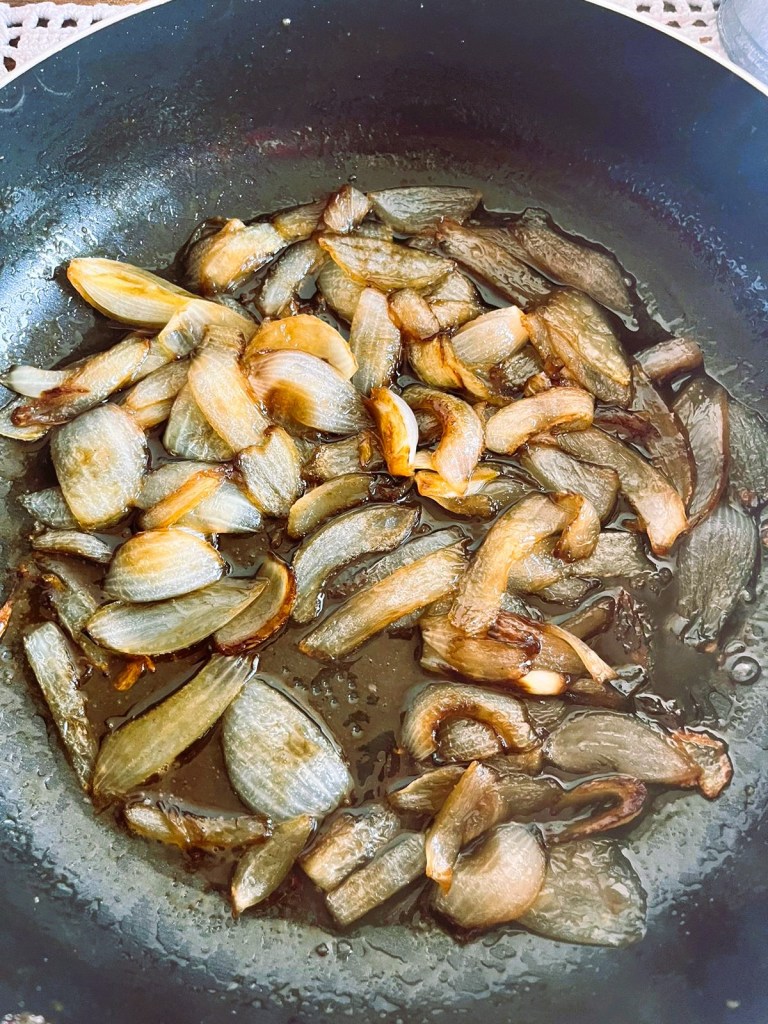 Na mesma panela, adicione um pouco mais de azeite, se necessário, e refogue as cebolas até ficarem macias e douradas. Adicione o alho e refogue por mais um minuto.