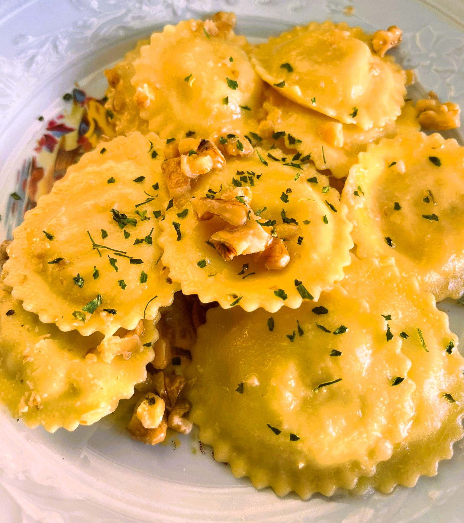 - Delicadamente, envolva os ravioli no molho de manteiga e nozes, adicionando um pouco da água da cozedura reservada conforme necessário para ajudar a formar um molho cremoso. Tempere com sal a gosto.