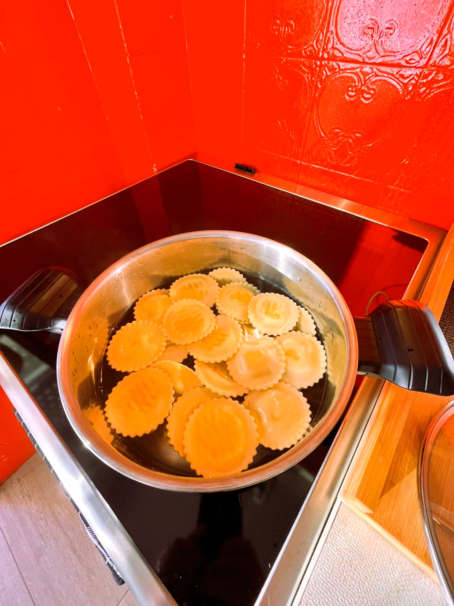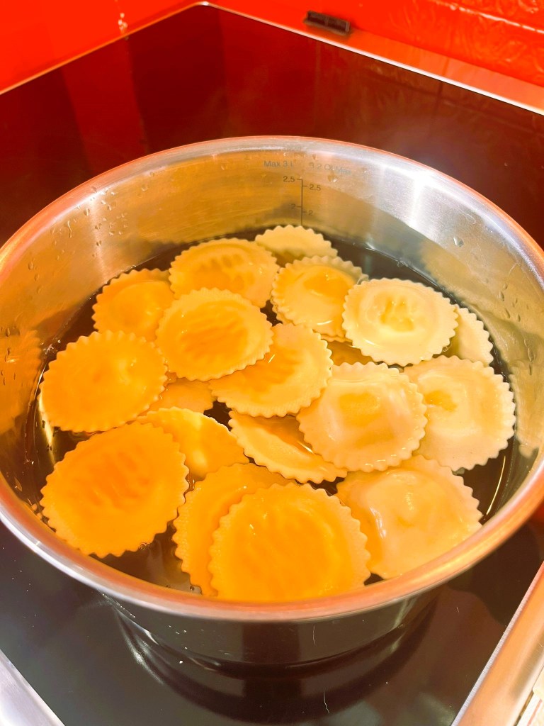 - Adicione os ravioli de queijo de cabra com cebola caramelizada à água fervente e coza durante cerca de 3 minutos.