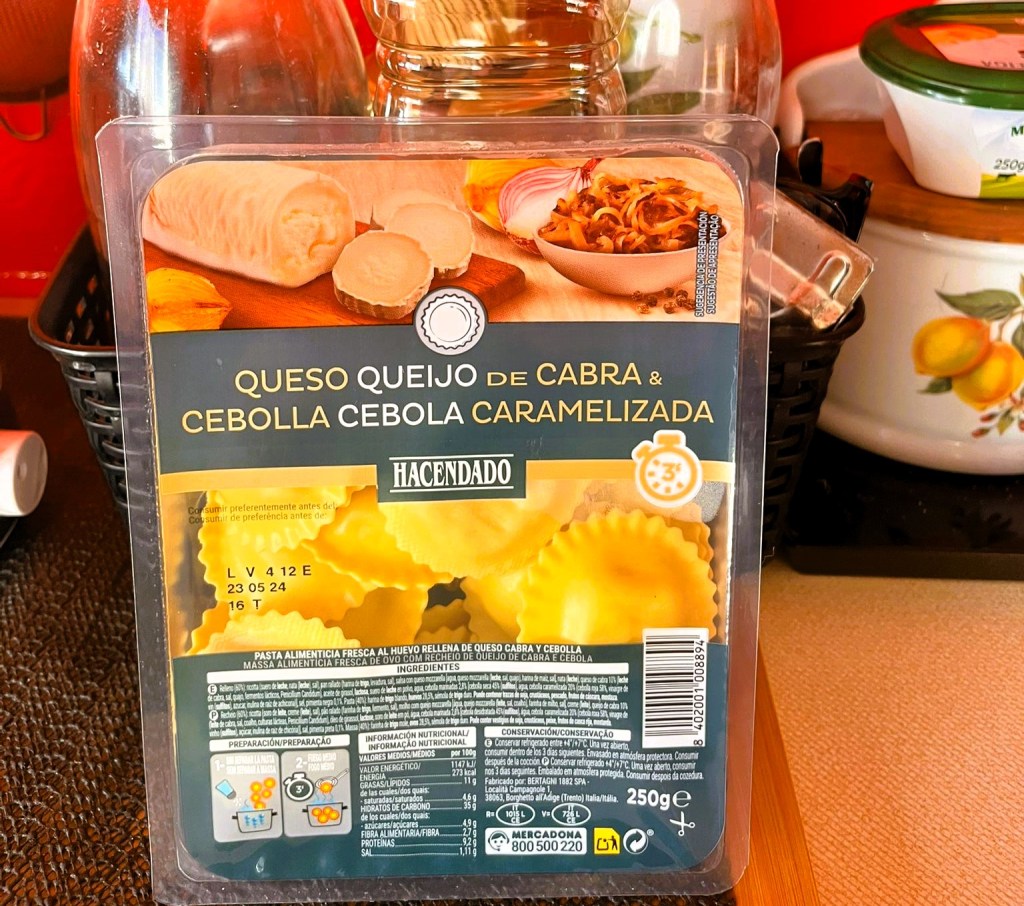 - 1 embalagem de ravioli de queijo de cabra com cebola caramelizada (do Mercadona)