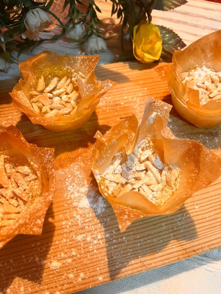 Já o doce de ovos, que utilizamos como recheio, é um pilar da pastelaria tradicional portuguesa. Originário das antigas receitas conventuais, este doce é uma verdadeira herança cultural, dando corpo e sabor a muitas das sobremesas mais apreciadas do nosso país. Nesta receita, a combinação da leveza estaladiça da massa filo com o suave doce de ovos e as crocantes amêndoas laminadas cria uma sobremesa delicada e irresistível.